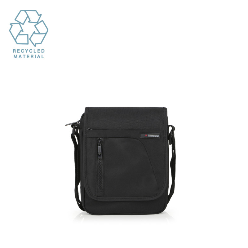 Bandolera con solapa de la colección Crony Eco. Fabricada en material reciclado y resistente al agua. Medidas: 19x24x7 cm.