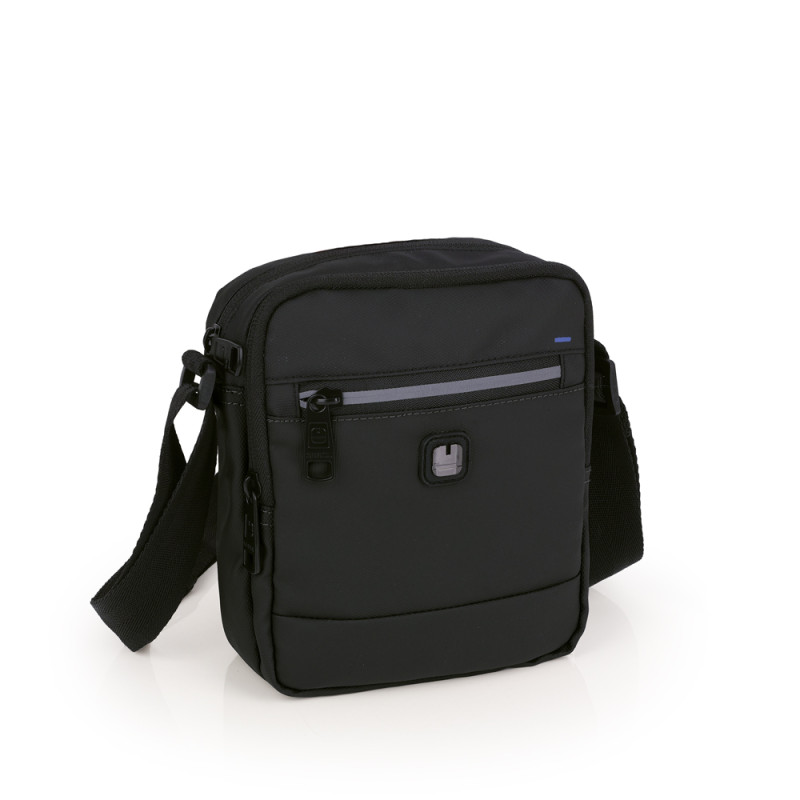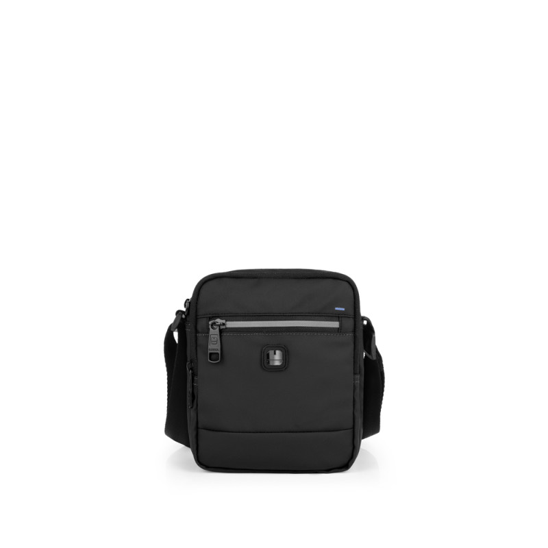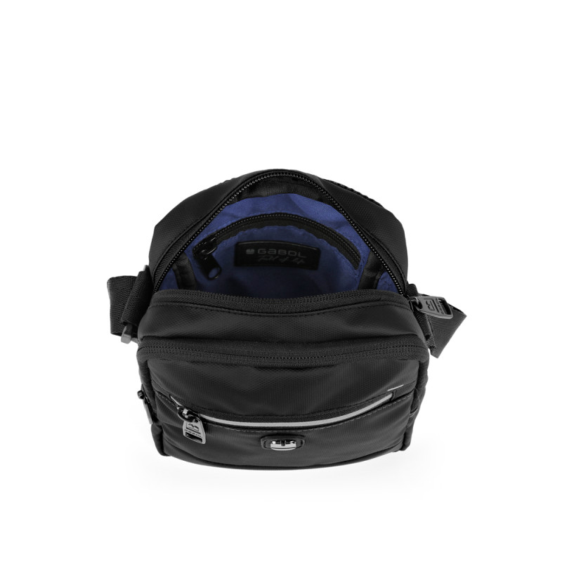 Bandolera pequeña con dos departamentos de la colección Flash. Fabricada en piel sintética, libre de plásticos PVC. . Medidas: 15x18x7 cm.