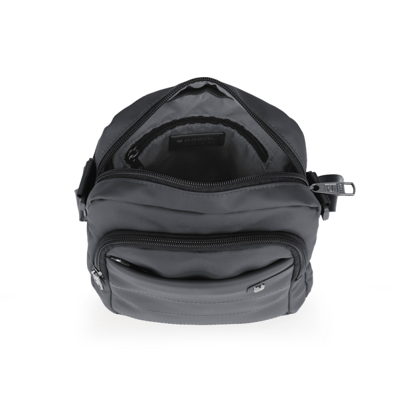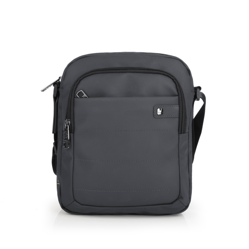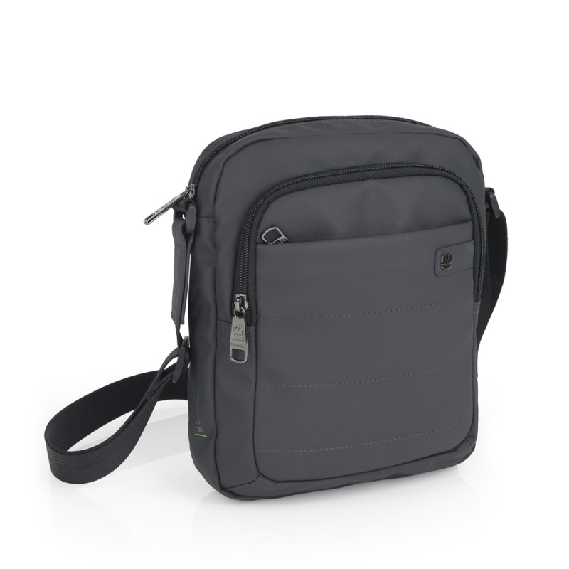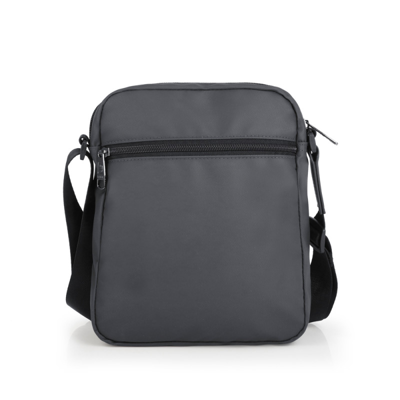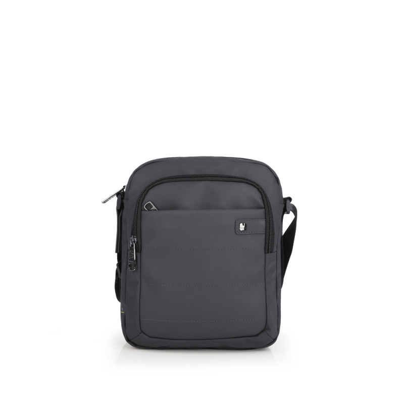Bandolera cruzada Joel de poliéster resinado y piel sintética, gris. Libre de plásticos PVC. Medidas: 20x25x8 cm