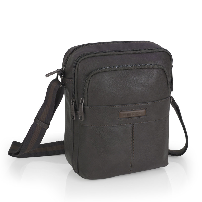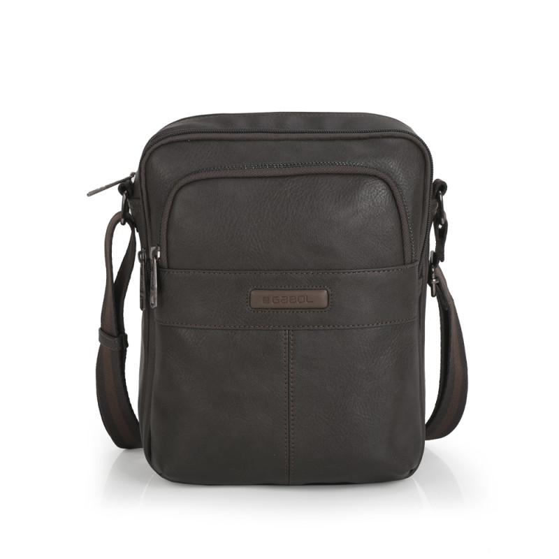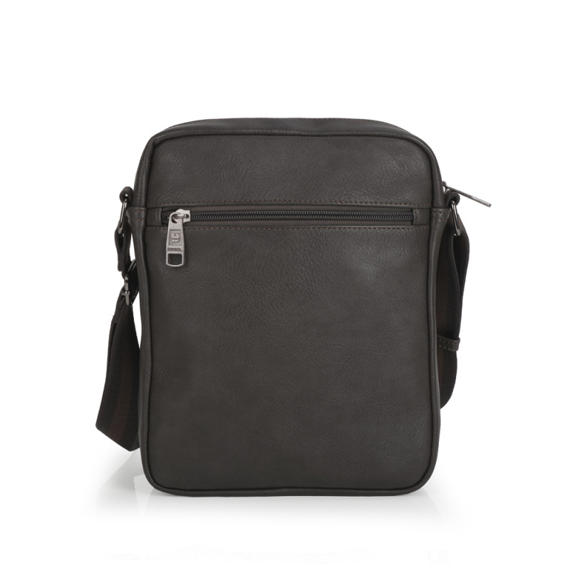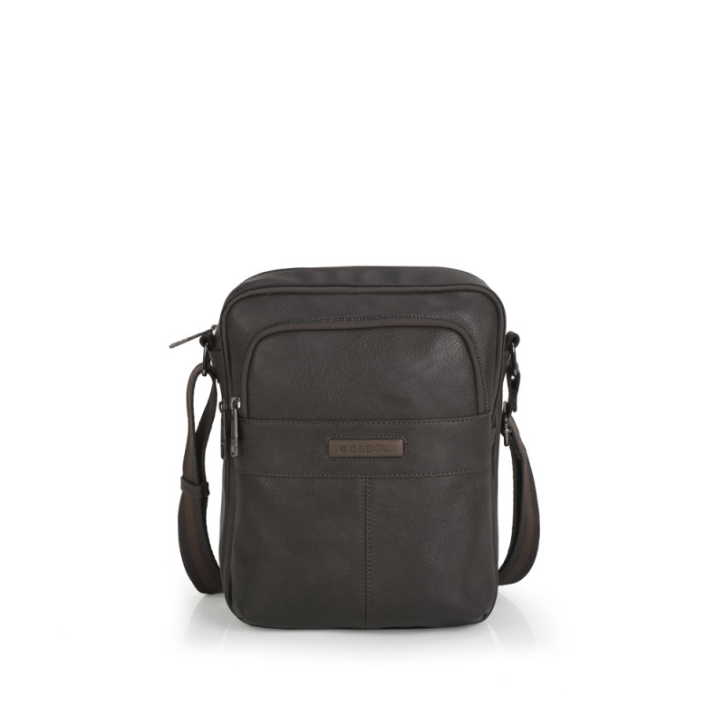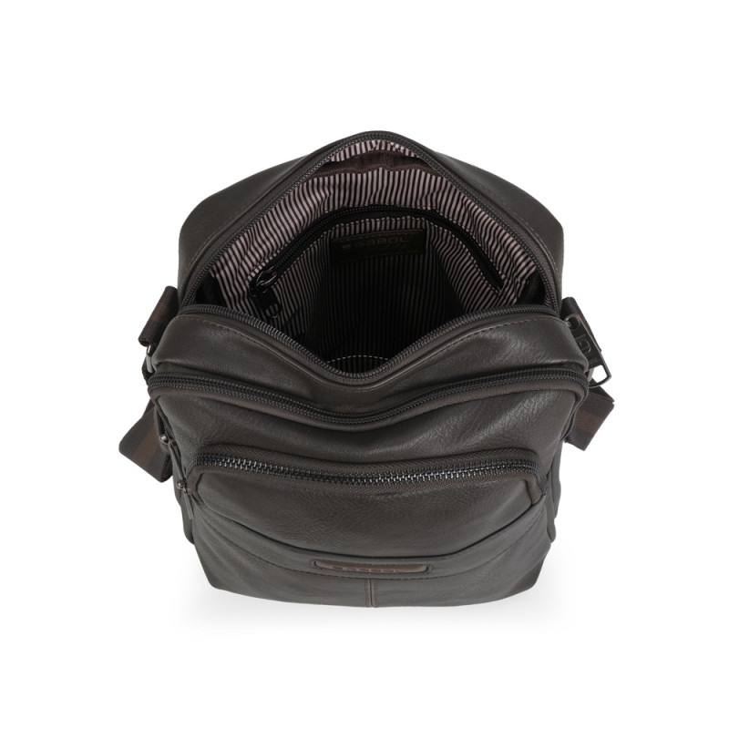 Bandolera grande con tres compartimentos de la colección Frank. Fabricada en piel sintética, libre de plásticos PVC. Cuenta con espacio para Ipad de 8''. Medidas: 20x25x8 cm.