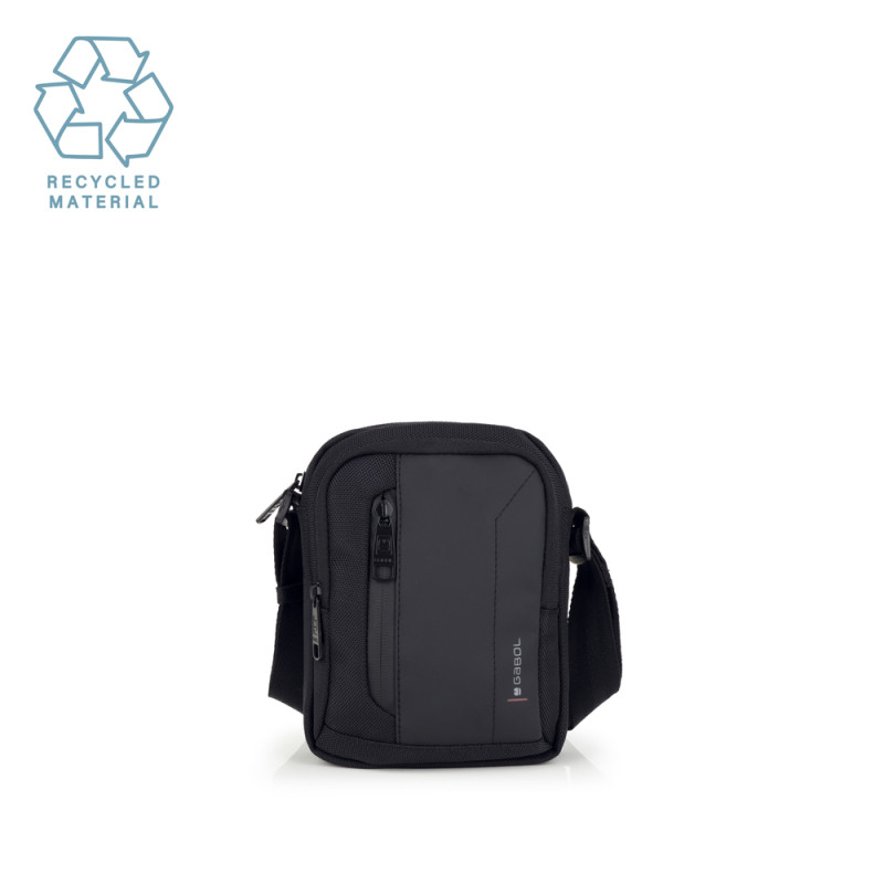 Bandolera pequeña de la colección Aston. Fabricada en material reciclado y piel sintética, libre de plásticos PVC y resistente al agua. Medidas: 15x19x7 cm.