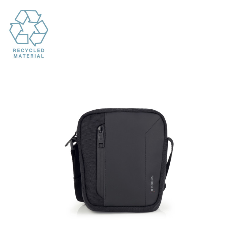 Bandolera de la colección Aston. Fabricada en material reciclado y piel sintética, libre de plásticos PVC y resistente al agua. Medidas: 18x22x5 cm.