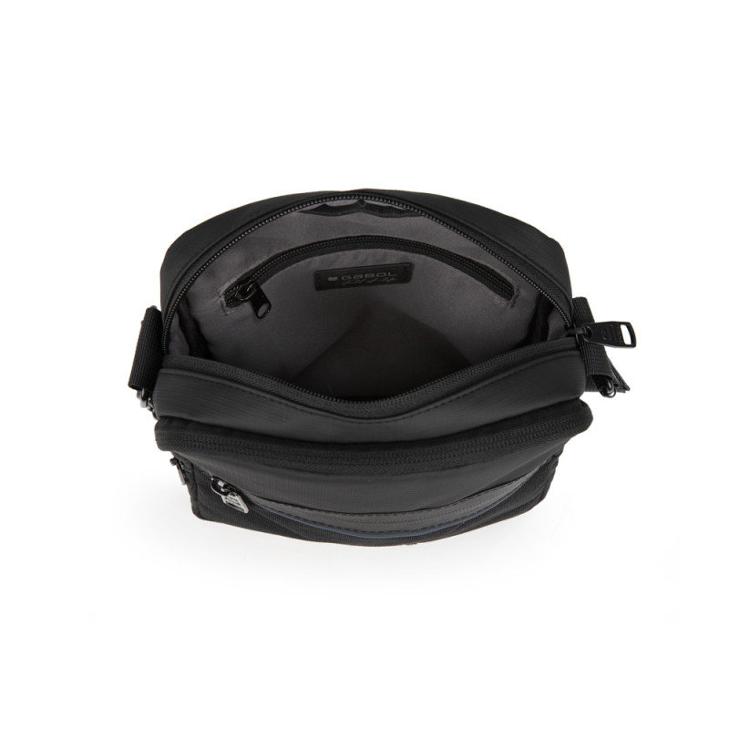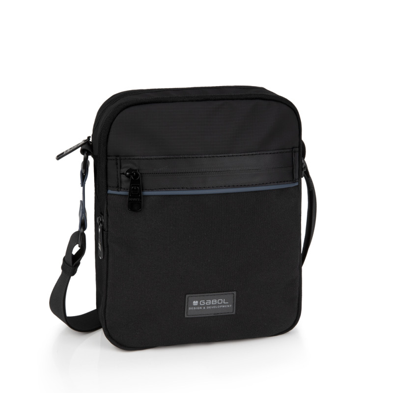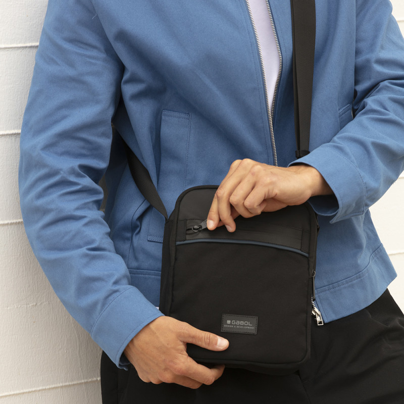 Bandolera mediana con dos compartimentos de la colección Darek. Fabricada en Poliéster y resinado, libre de plásticos PVC y resistente al agua. Medidas: 20x25x8 cm.