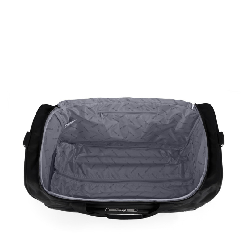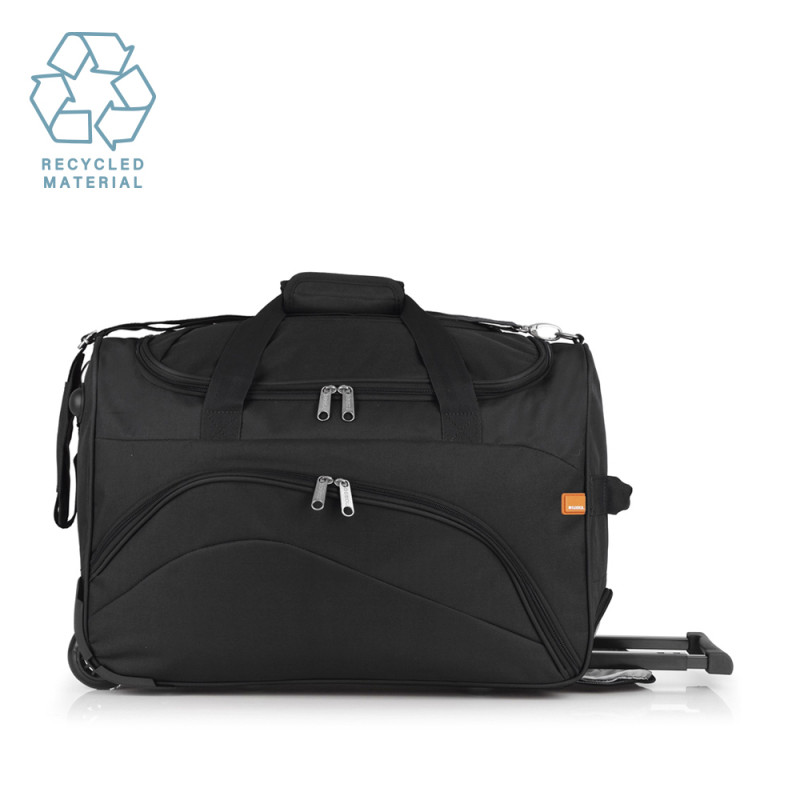 Bolso de viaje pequeño con 2 ruedas fabricado con material de plástico reciclado. Interior forrado y con varios compartimentos.