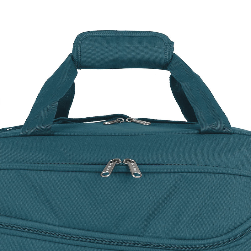 Bolso de viaje fabricado con material de plástico reciclado. Lleva acople a maleta para facilitar su transporte. Interior forrado y con varios bolsillos.
