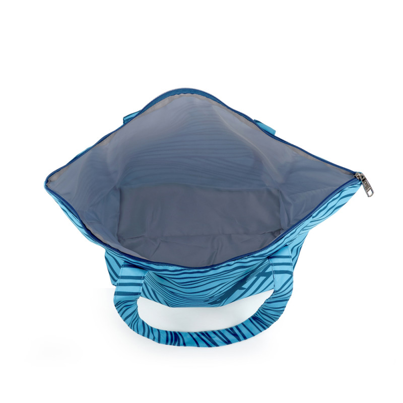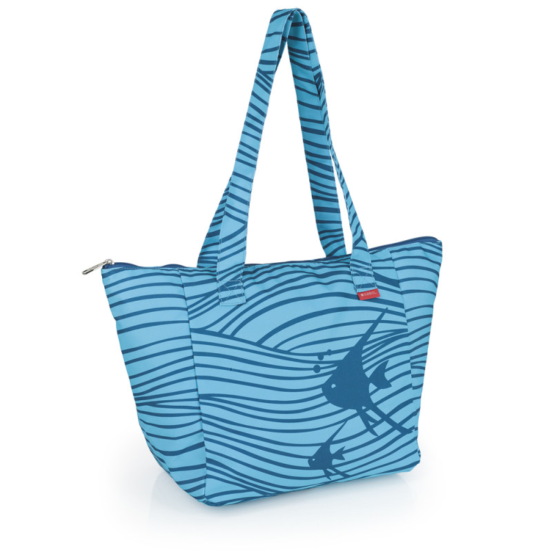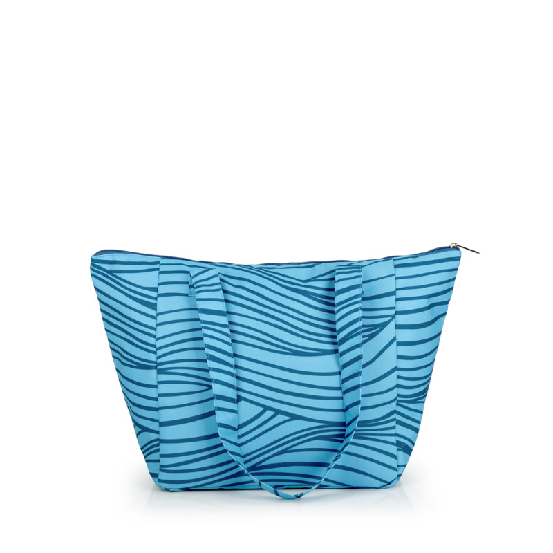 Bolso playa de poliéster, azul. Resistente con capacidad hasta 31,4 L. Libre de plásticos PVC. Medidas: 54x34x21 cm.