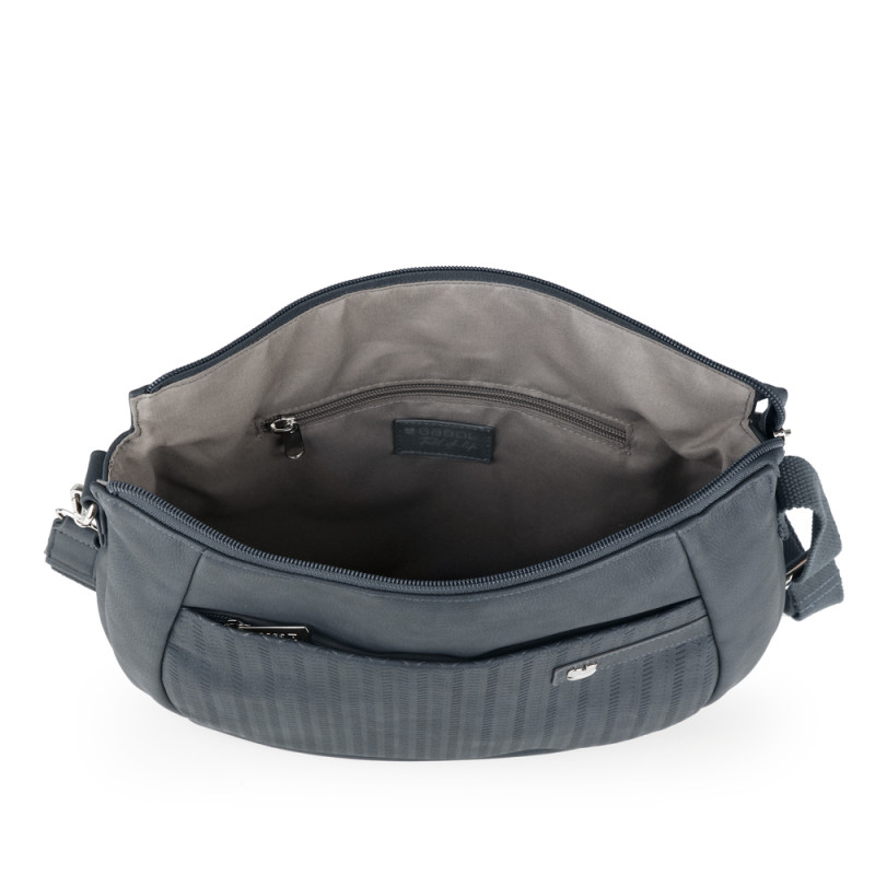 Bolso bandolera de piel sintética, azul. Fabricado con materiales libres de PVC. Incluye bandolera de seguridad. Con ella podrás enganchar la correa para evitar hurtos. Medidas: 33x24x6 cm