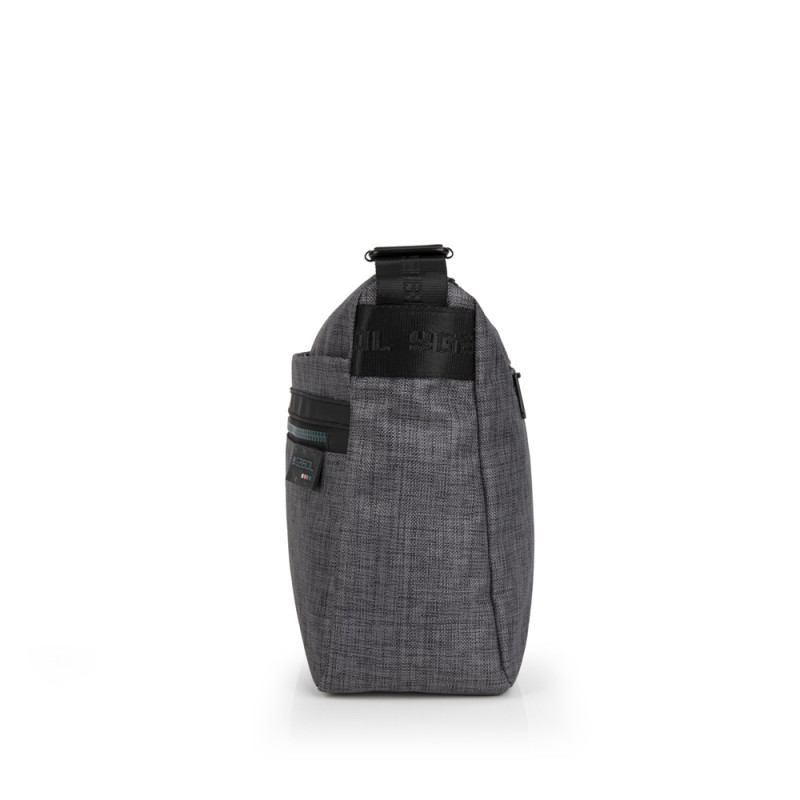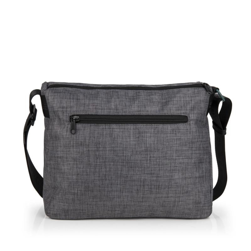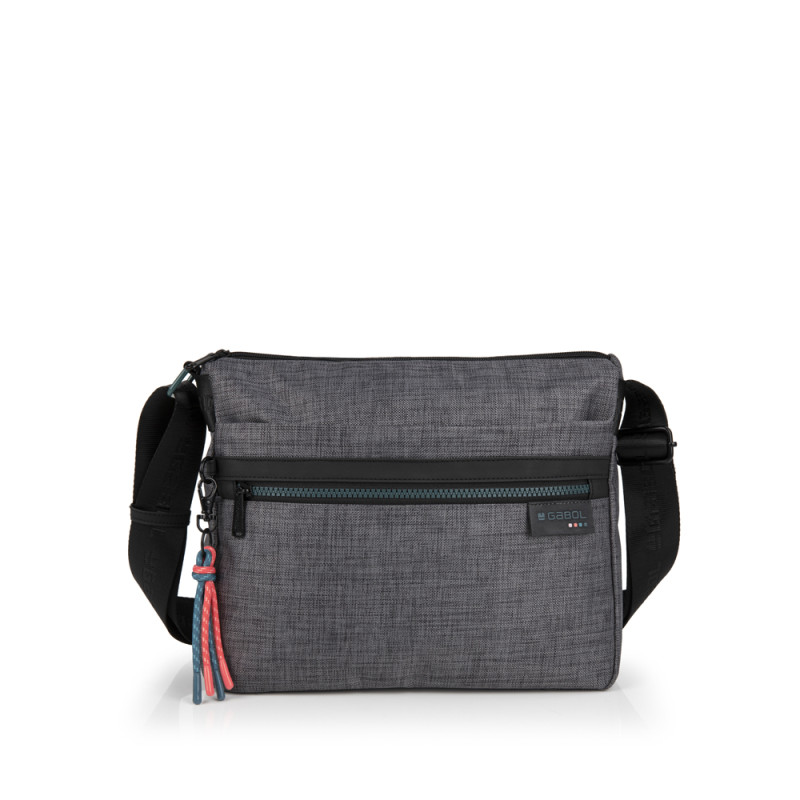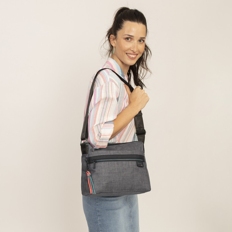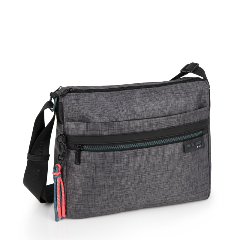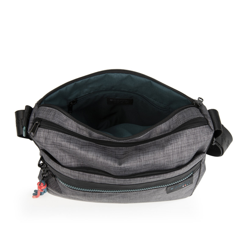 Bolso mediano de la colección SHANI, fabricado en poliéster de color gris, con cremalleras de color azul y un llavero de tonos azules y corales para hacer tu bolso diario más llamativo. Con un diseño práctico que ofrece dos compartimentos, además su bolsillo frontal le aporta funcionalidad. Medidas: 30 x 24 x 11 cm, volumen: 6 L, peso: 0,34 kg. Libre de plásticos PVC.