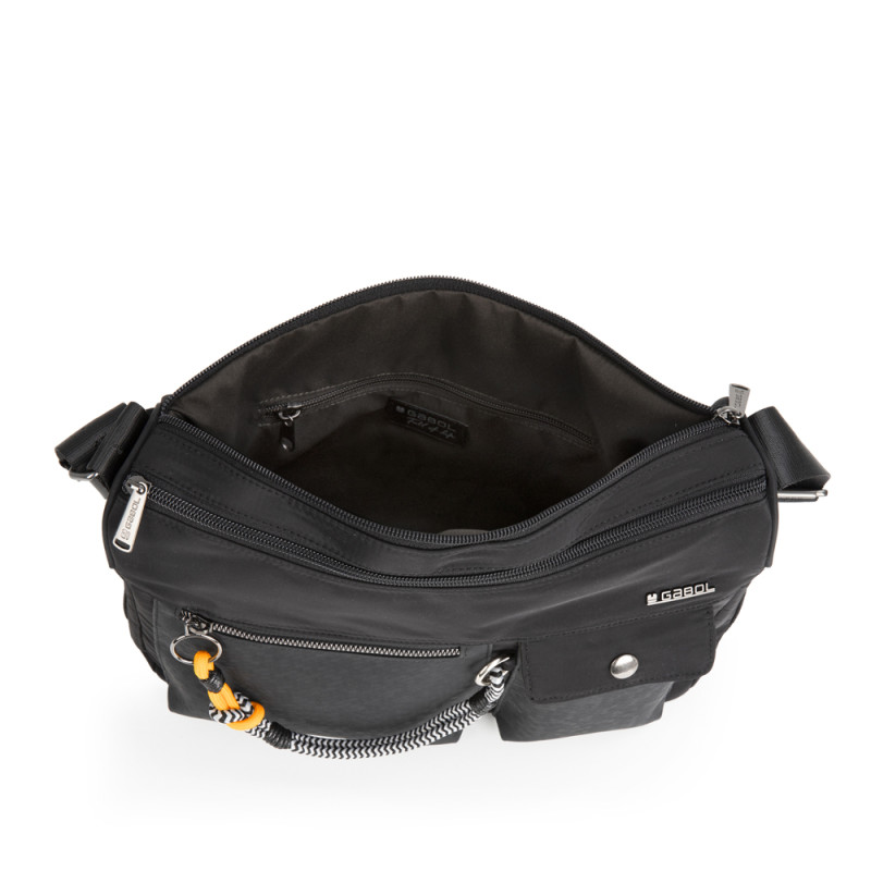 Bolso mediano de la colección AISHA con un diseño de dos compartimentos. Su diseño es moderno y un acento de color naranja, para quienes apuestan más por moda más rompedora. Con una capacidad de 5,6 L y un peso de 0,40 kg. Medidas: 33 x 24 x 9 cm. Una colección resistente al agua y libre de plástico PVC.