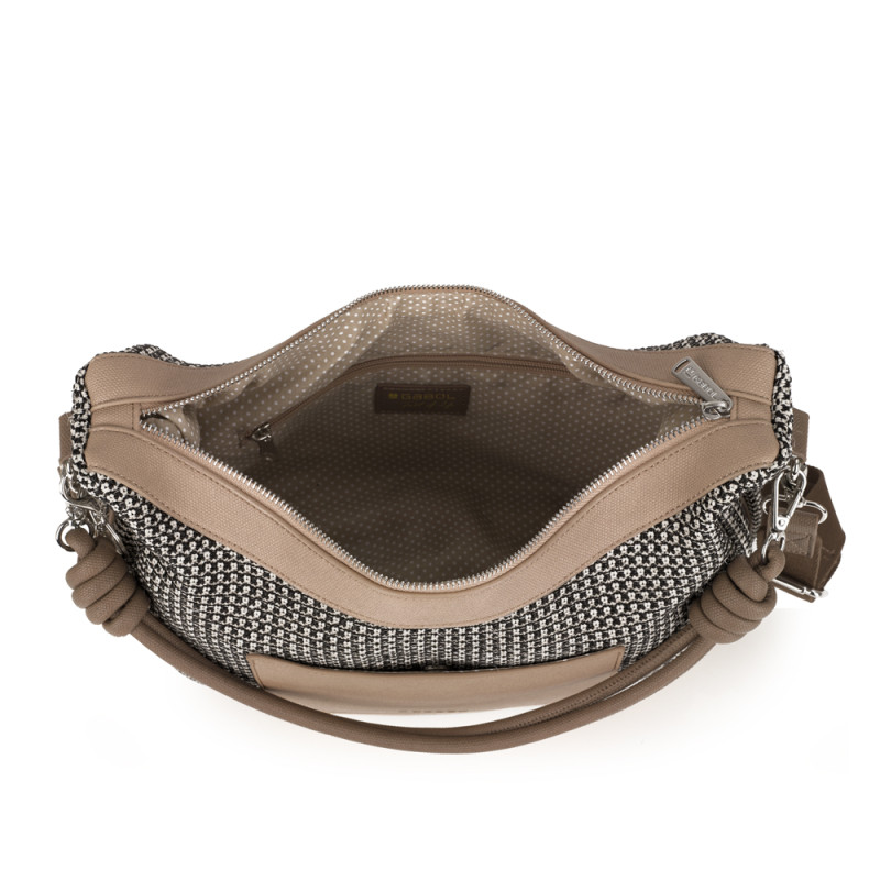 Bolso mediano de la colección Dolce. Fabricado con efecto rafia y piel sintética. Además está fabricado con materiales libres de plástico PVC. Medidas: 34x31x10 cm.