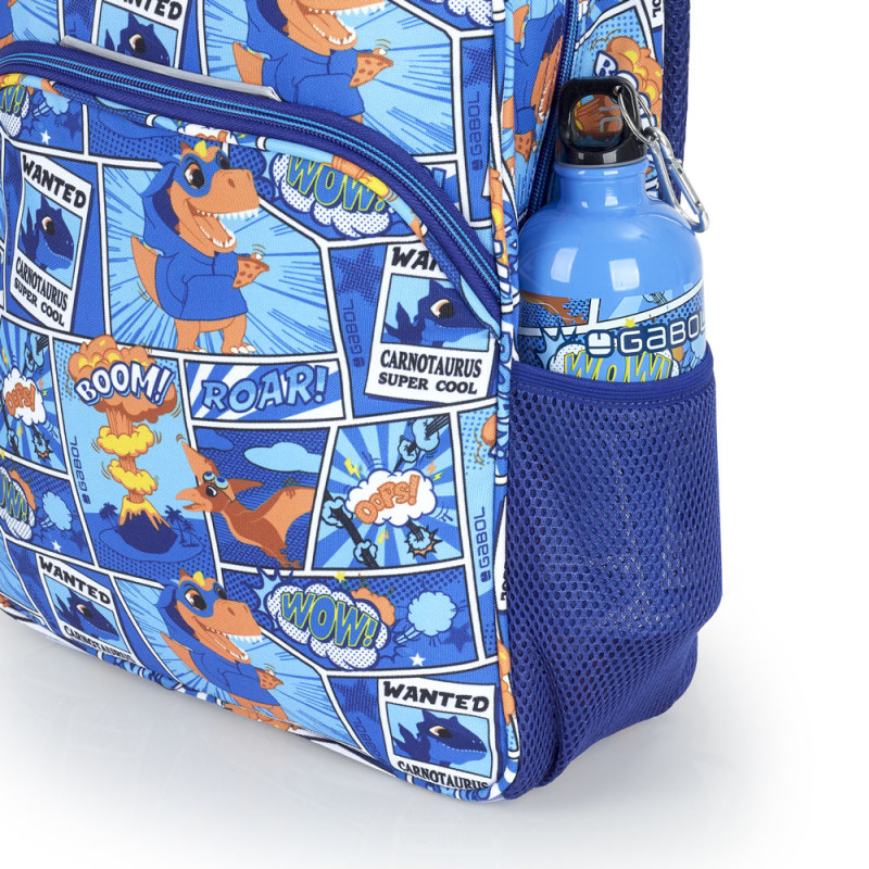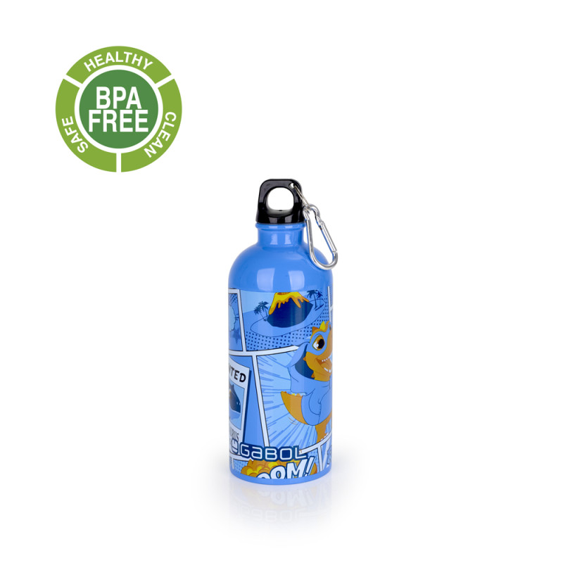 Botella de acero inoxidable Gabol DINO. Botella de acero inoxidable libre de BPA de 600ml. Cierre de rosca con mosquetón para poder engancharla. Fabricada con material libre de PVC. Medidas: 7x21x7cm