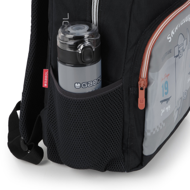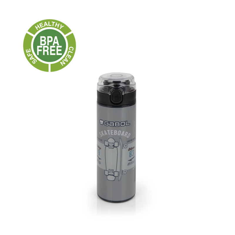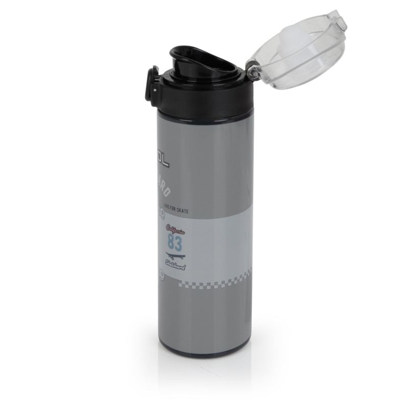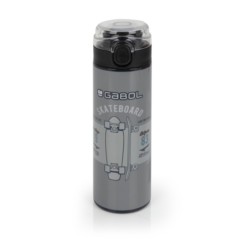 Botella de acero inoxidable Gabol TRICK. Cuenta con un sistema de bloqueo y una base antideslizante. Capacidad de 600ml. Libre de PVC. Medidas: 6,5x22,5x6,5cm.