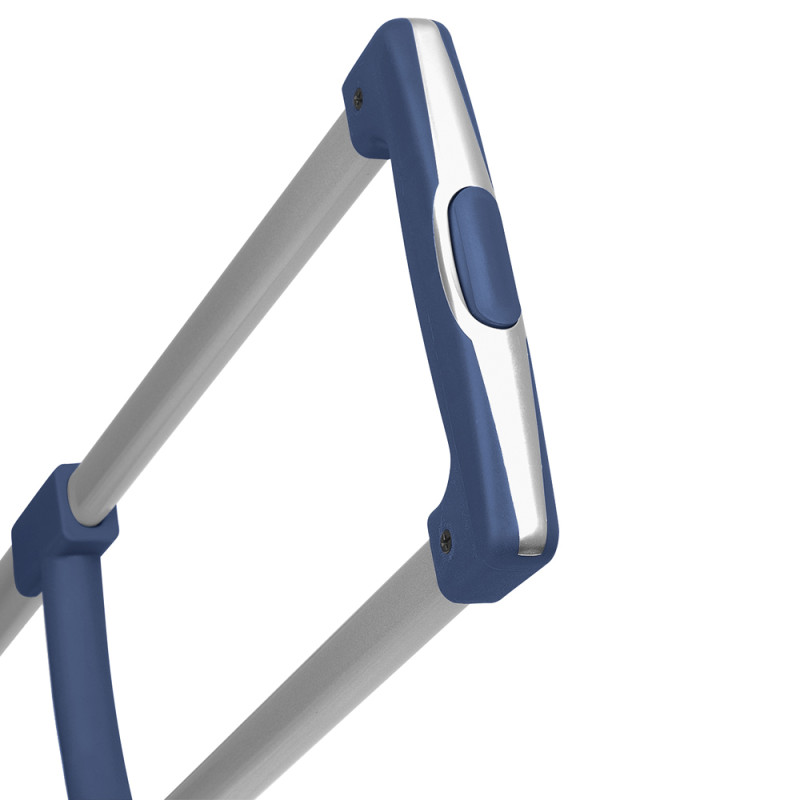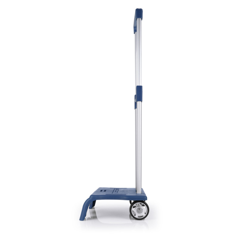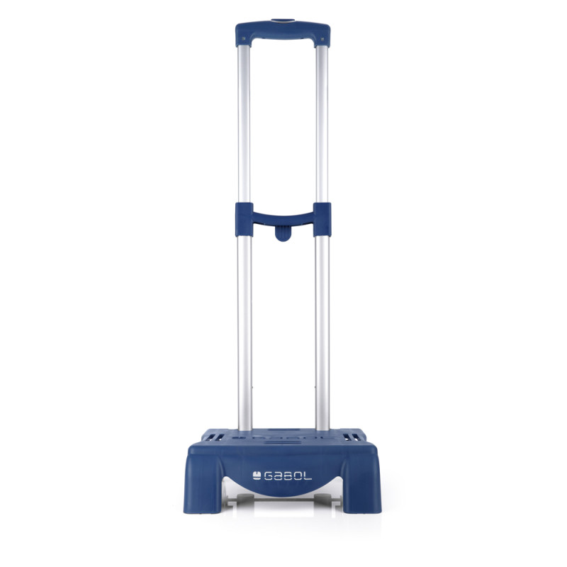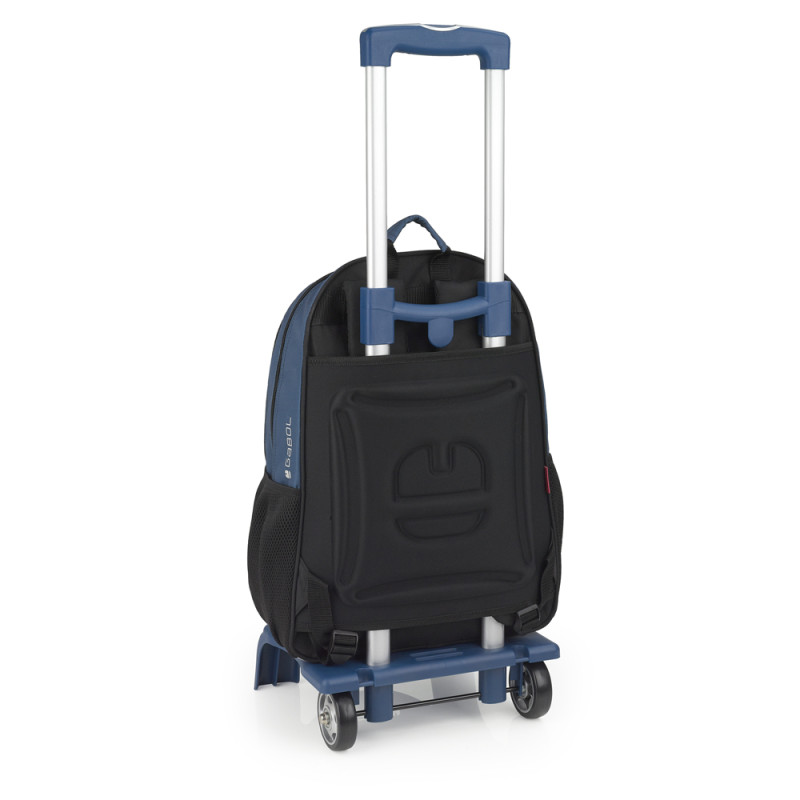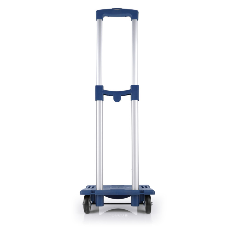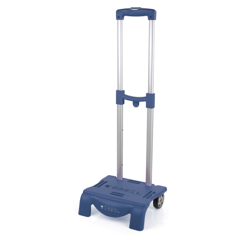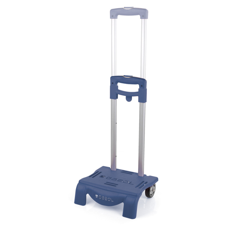 Carro escolar para acoplar la mochila. Dos ruedas. Tirador extensible con botón. 85,5 cm de altura con el tirador totalmente extendido.