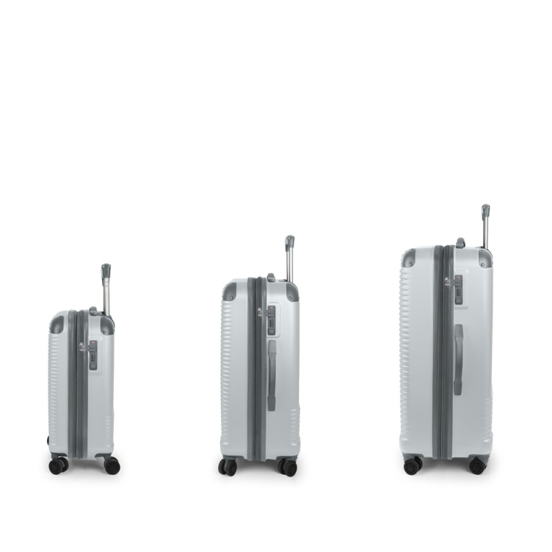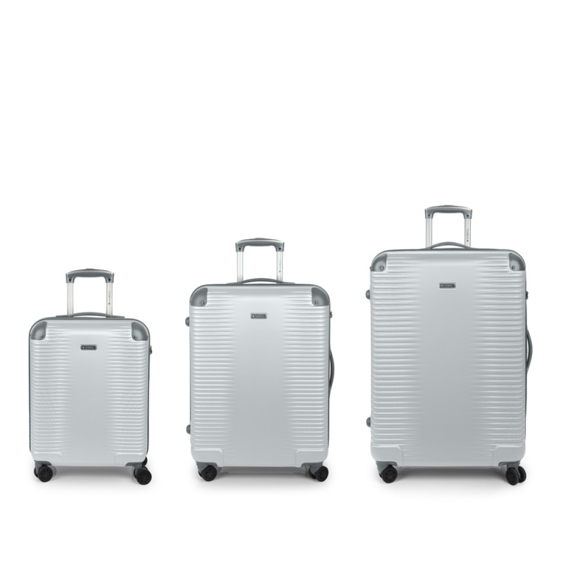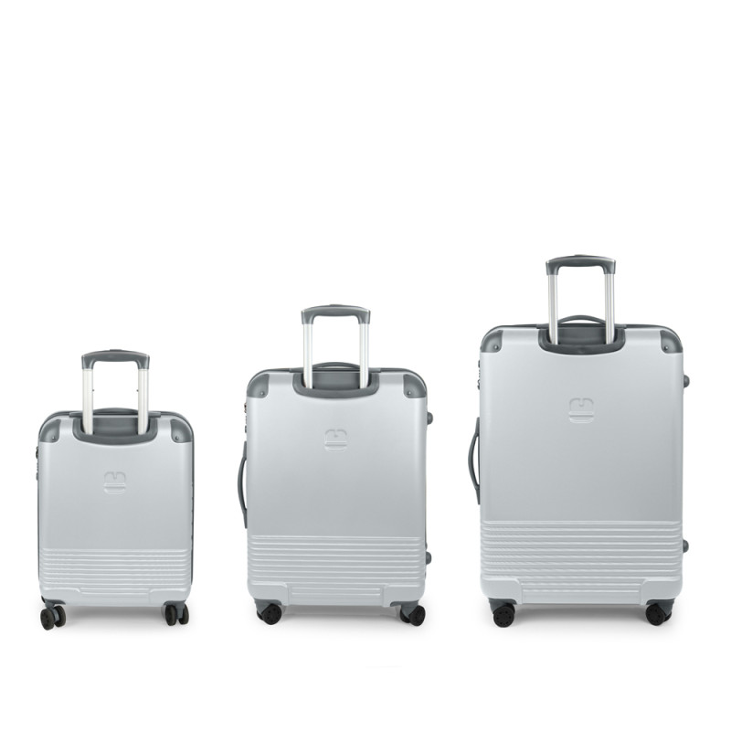 Juego de 3 maletas (Cabina, Mediana y Grande) rígidas, expandibles y 4 ruedas dobles multidirección. Fabricadas en ABS. Su interior está compuesto por un forro de alta calidad de material reciclado (RPET) con separador y bolsillo. Cerradura TSA. Medidas sin y con expandible: Maleta Cabina: 55x40x22/25 cm - Peso: 2,7 kg - Capacidad: 39,7/45 L. Maleta Mediana: 66x48x27/30 cm - Peso: 3,8 kg - Capacidad: 68,8/77,9 L. Maleta Grande: 77x55x33/35 cm - Peso: 4,6 kg - Capacidad: 111,8/118,7 L.