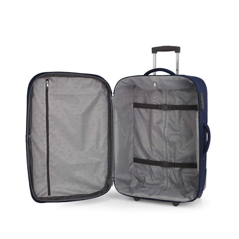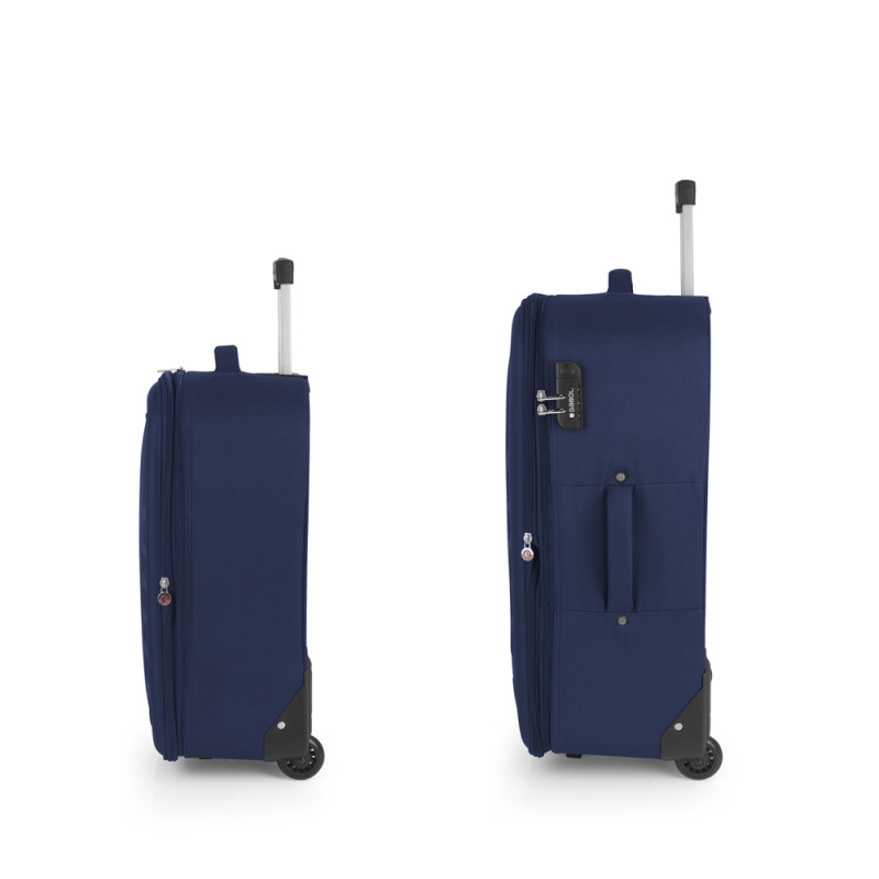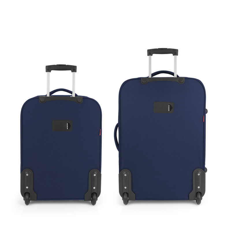 Juego de 2 maletas (Cabina y Mediana) blanda, expandibles y 2 ruedas. Fabricadas con Poliéster. Su interior está compuesto con un bolsillo organizador. Cerradura de combinación. Medidas sin y con expandible: Maleta Cabina: 40x55x23/27 cm - Peso: 2,5 kg - Capacidad: 45,9/53 L. Maleta Mediana: 44x66x27/31,5 cm - Peso: 2,8 kg - Capacidad: 66,6/76,9 L.