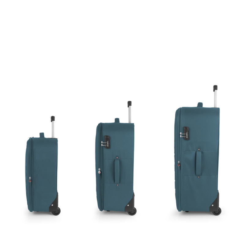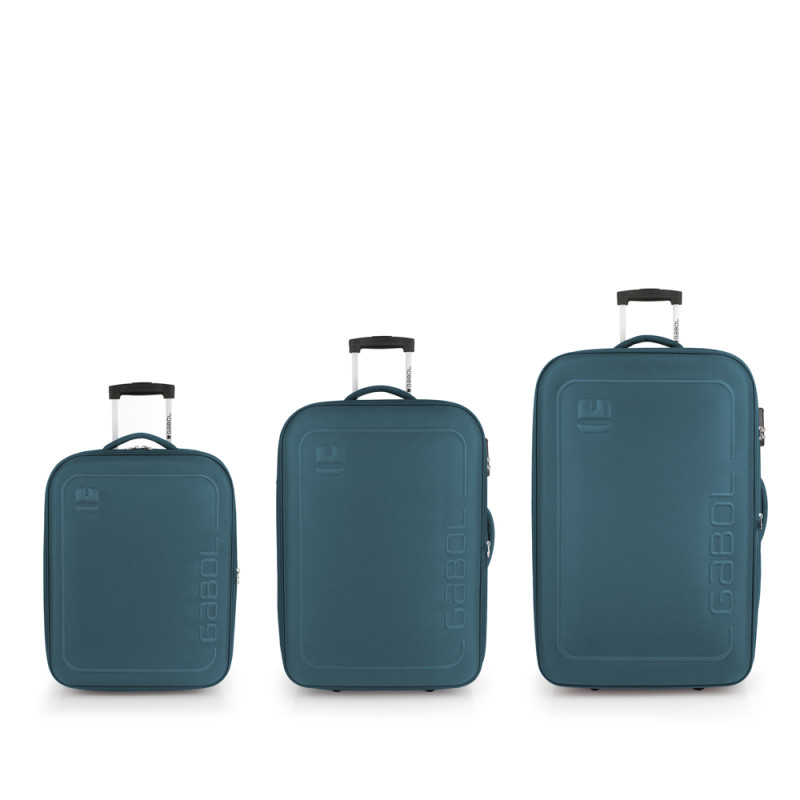 Juego de 3 maletas (Cabina, Mediana y Grande) blanda, expandibles y 4 ruedas multidrección. Fabricadas con Poliéster. Su interior está compuesto con un bolsillo organizador. Cerradura de combinación. Medidas sin y con expandible: Maleta Cabina: 40x55x23/27 cm - Peso: 2,5 kg - Capacidad: 45,9/53 L. Maleta Mediana: 44x66x27/31,5 cm - Peso: 2,8 kg - Capacidad: 66,6/76,9 L. Maleta Grande: 47x76x31,5 cm - Peso: 3,2 kg - Capacidad: 89,5/105,5 L.