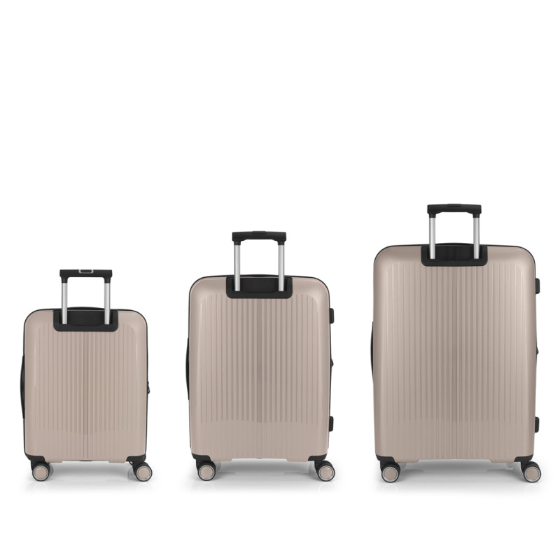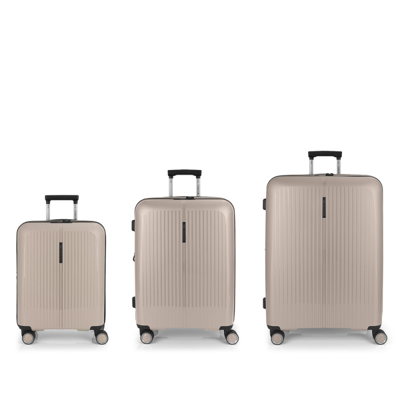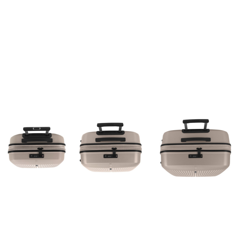 Juego de 3 maletas (Cabina, Mediana y Grande) rígidas y 4 ruedas dobles multidirección. Expandibles en todos los tamaños. Fabricadas en Polipropileno. Su interior esta compuesto por un forro de material reciclado, con doble separador y bolsllos. Cremallera de seguridad. Cerradura TSA. 10 años de garantía. Medidas sin y con expandible: Maleta Cabina: 40x55x22/25cm - Peso: 2,8 kg - Capacidad: 41,7/47,4 L. Maleta Mediana: 45x65x27/30 cm - Peso: 3,4 kg - Capacidad: 70/77,8 L. Maleta Grande: 51x75x31/34 cm - Peso: 4,5 kg - Capacidad: 109/119,6 L.