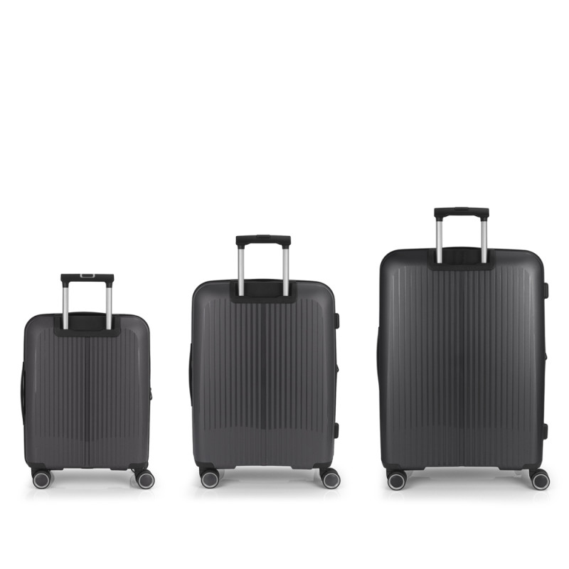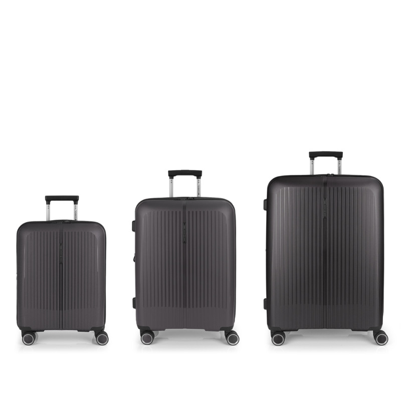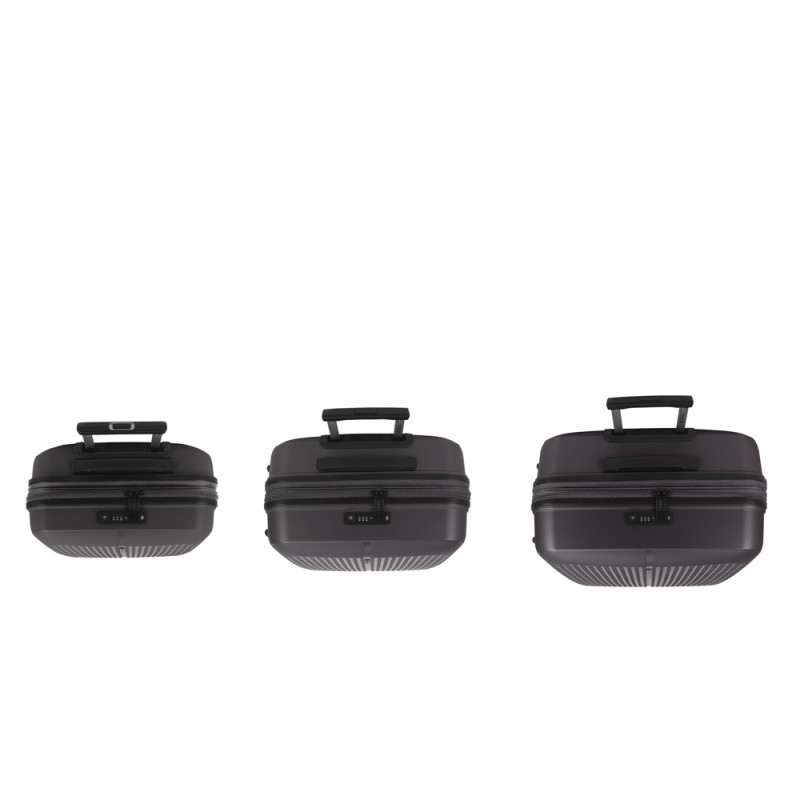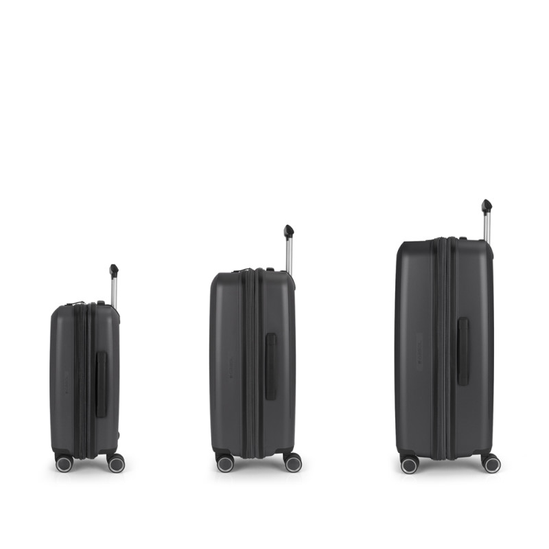 Juego de 3 maletas (Cabina, Mediana y Grande) rígidas y 4 ruedas dobles multidirección. Expandibles en todos los tamaños. Fabricadas en Polipropileno. Su interior esta compuesto por un forro de material reciclado, con doble separador y bolsllos. Cremallera de seguridad. Cerradura TSA. 10 años de garantía. Medidas sin y con expandible: Maleta Cabina: 40x55x22/25cm - Peso: 2,8 kg - Capacidad: 41,7/47,4 L. Maleta Mediana: 45x65x27/30 cm - Peso: 3,4 kg - Capacidad: 70/77,8 L. Maleta Grande: 51x75x31/34 cm - Peso: 4,5 kg - Capacidad: 109/119,6 L.