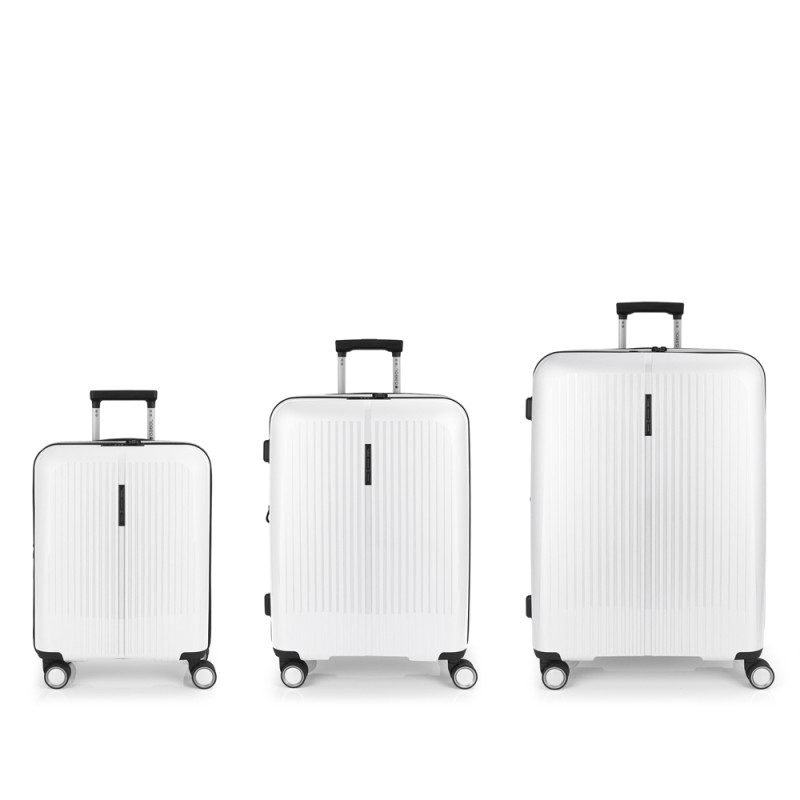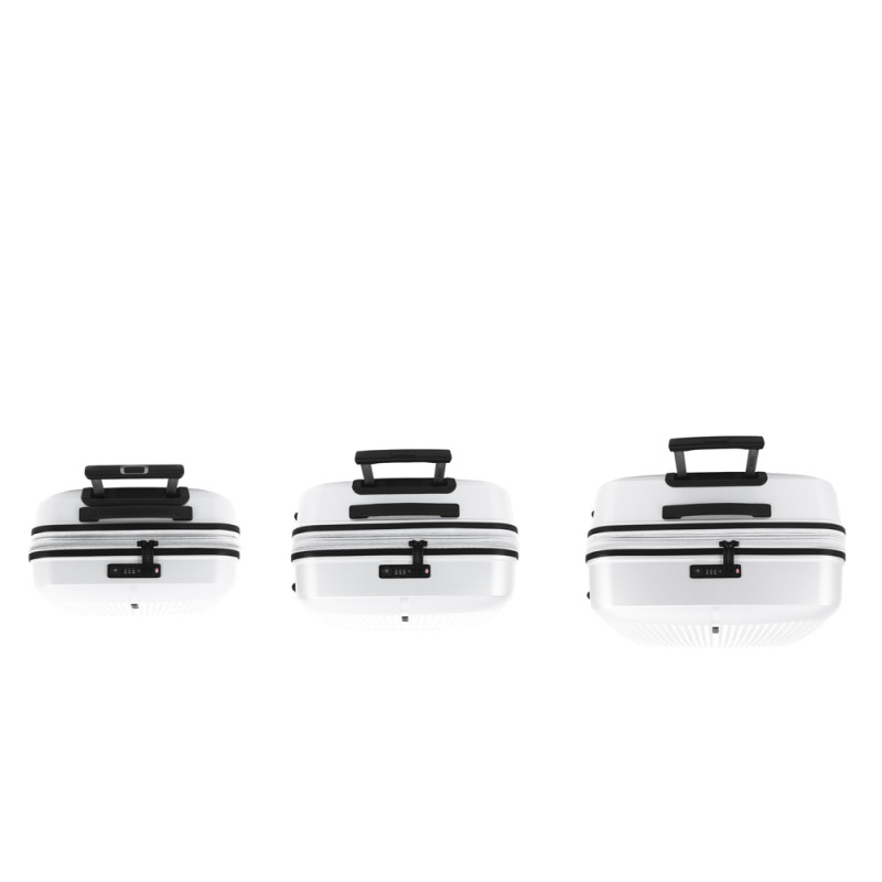Juego de 3 maletas (Cabina, Mediana y Grande) rígidas y 4 ruedas dobles multidirección. Expandibles en todos los tamaños. Fabricadas en Polipropileno. Su interior esta compuesto por un forro de material reciclado, con doble separador y bolsllos. Cremallera de seguridad. Cerradura TSA. 10 años de garantía. Medidas sin y con expandible: Maleta Cabina: 40x55x22/25cm - Peso: 2,8 kg - Capacidad: 41,7/47,4 L. Maleta Mediana: 45x65x27/30 cm - Peso: 3,4 kg - Capacidad: 70/77,8 L. Maleta Grande: 51x75x31/34 cm - Peso: 4,5 kg - Capacidad: 109/119,6 L.