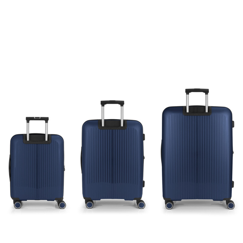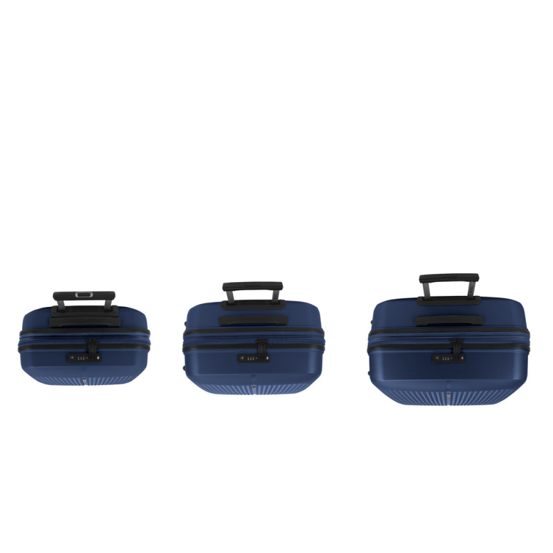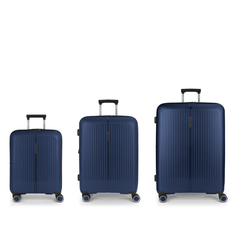Juego de 3 maletas (Cabina, Mediana y Grande) rígidas y 4 ruedas dobles multidirección. Expandibles en todos los tamaños. Fabricadas en Polipropileno. Su interior esta compuesto por un forro de material reciclado, con doble separador y bolsllos. Cremallera de seguridad. Cerradura TSA. 10 años de garantía. Medidas sin y con expandible: Maleta Cabina: 40x55x22/25cm - Peso: 2,8 kg - Capacidad: 41,7/47,4 L. Maleta Mediana: 45x65x27/30 cm - Peso: 3,4 kg - Capacidad: 70/77,8 L. Maleta Grande: 51x75x31/34 cm - Peso: 4,5 kg - Capacidad: 109/119,6 L.