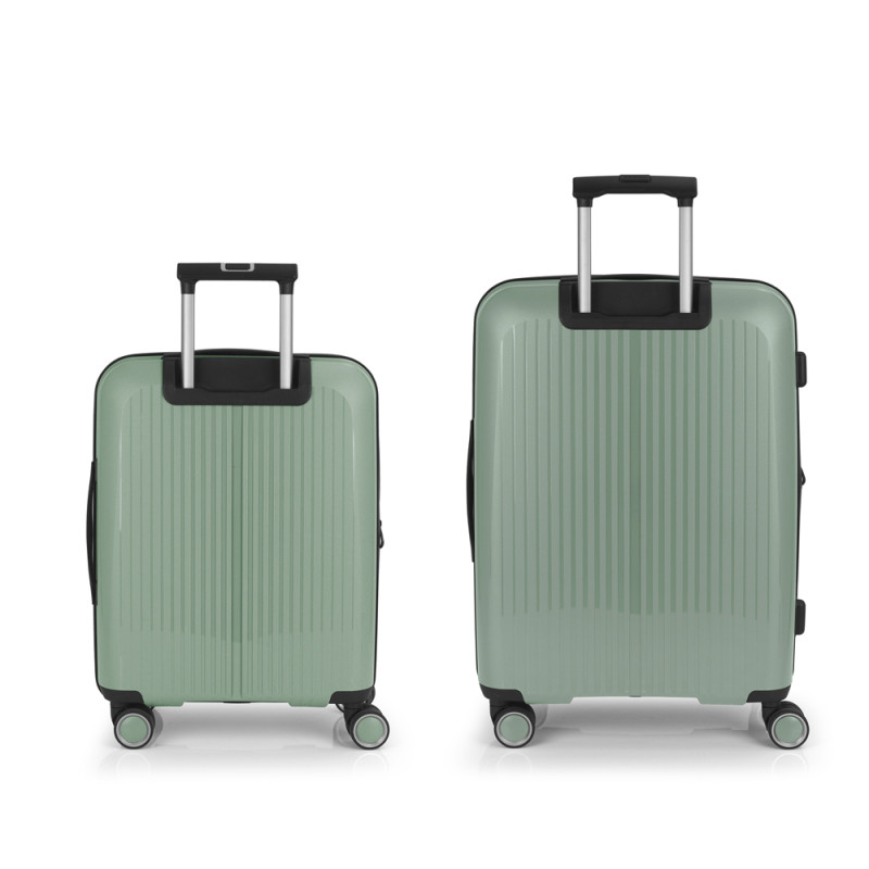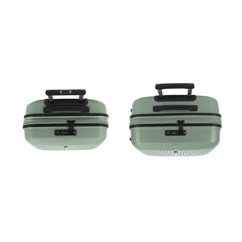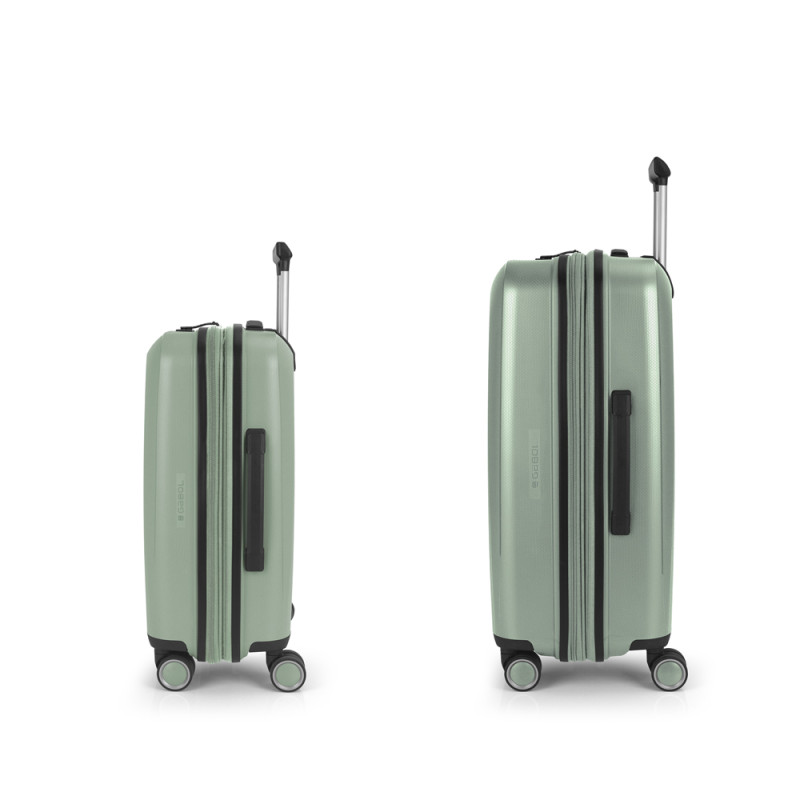 Juego de 2 maletas (Cabina y Mediana) rígidas y 4 ruedas dobles multidirección. Expandibles en todos los tamaños. Fabricadas en Polipropileno. Su interior esta compuesto por un forro de material reciclado, con doble separador y bolsllos. Cremallera de seguridad. Cerradura TSA. 10 años de garantía. Medidas sin y con expandible: Maleta Cabina: 40x55x22/25cm - Peso: 2,8 kg - Capacidad: 41,7/47,4 L. Maleta Mediana: 45x65x27/30 cm - Peso: 3,4 kg - Capacidad: 70/77,8 L.