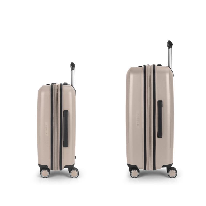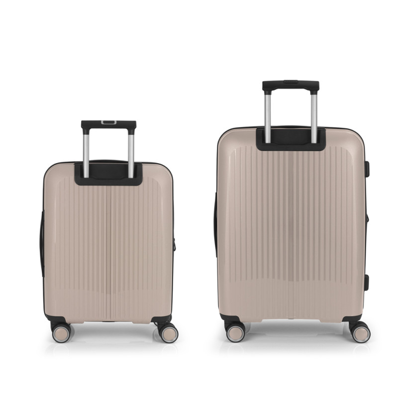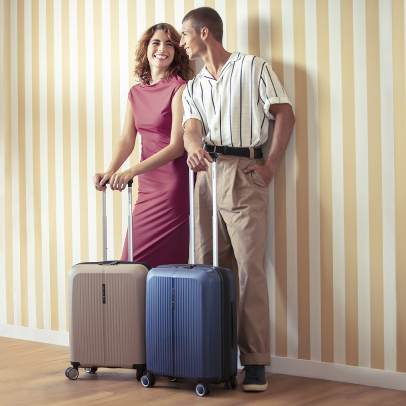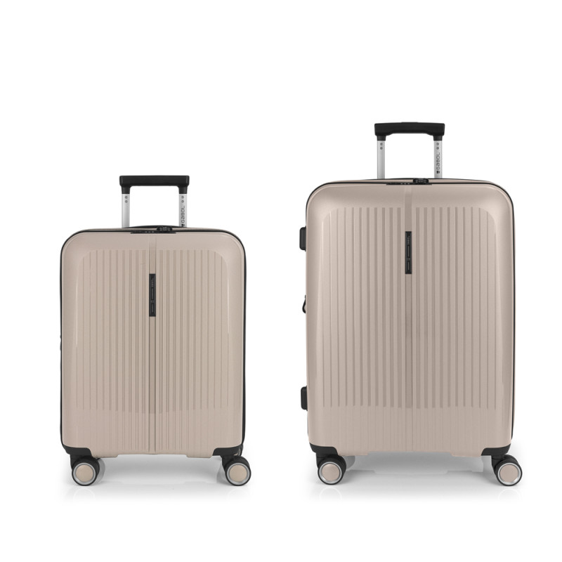 Juego de 2 maletas (Cabina y Mediana) rígidas y 4 ruedas dobles multidirección. Expandibles en todos los tamaños. Fabricadas en Polipropileno. Su interior esta compuesto por un forro de material reciclado, con doble separador y bolsllos. Cremallera de seguridad. Cerradura TSA. 10 años de garantía. Medidas sin y con expandible: Maleta Cabina: 40x55x22/25cm - Peso: 2,8 kg - Capacidad: 41,7/47,4 L. Maleta Mediana: 45x65x27/30 cm - Peso: 3,4 kg - Capacidad: 70/77,8 L.
