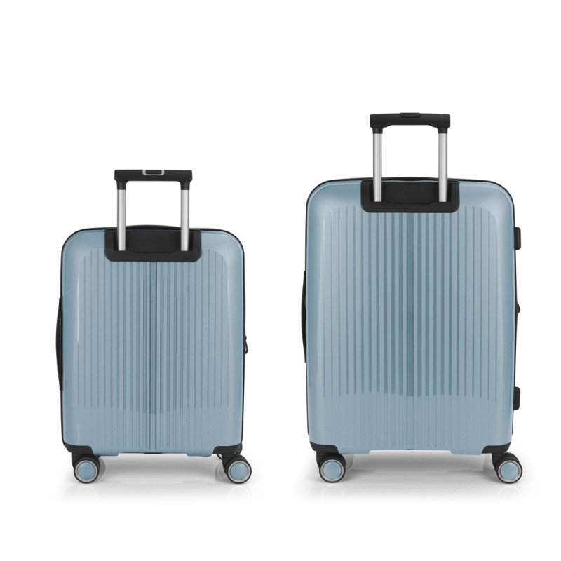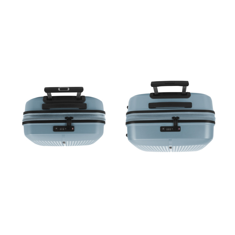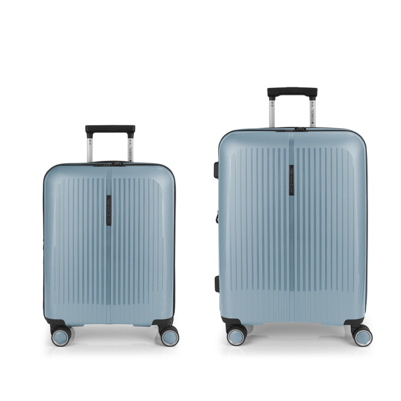 Juego de 2 maletas (Cabina y Mediana) rígidas y 4 ruedas dobles multidirección. Expandibles en todos los tamaños. Fabricadas en Polipropileno. Su interior esta compuesto por un forro de material reciclado, con doble separador y bolsllos. Cremallera de seguridad. Cerradura TSA. 10 años de garantía. Medidas sin y con expandible: Maleta Cabina: 40x55x22/25cm - Peso: 2,8 kg - Capacidad: 41,7/47,4 L. Maleta Mediana: 45x65x27/30 cm - Peso: 3,4 kg - Capacidad: 70/77,8 L.