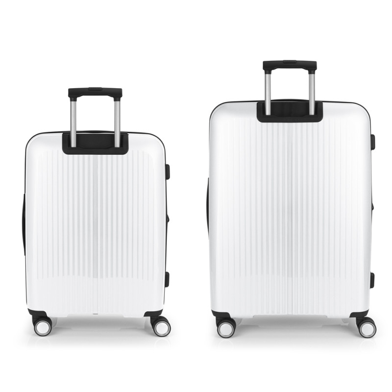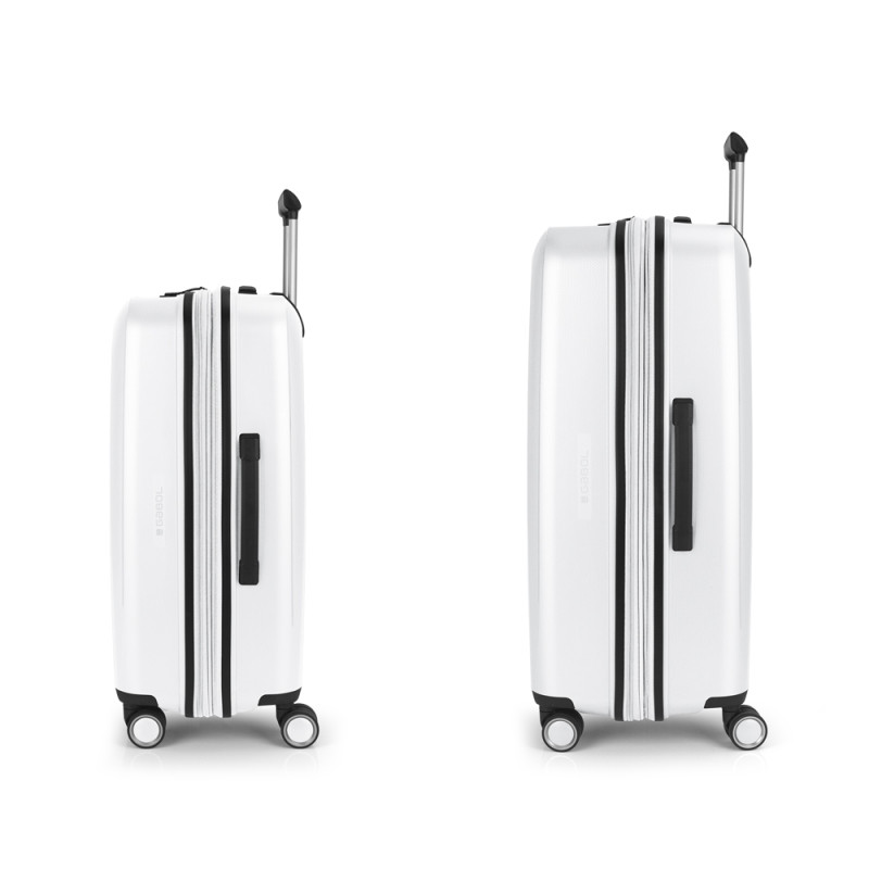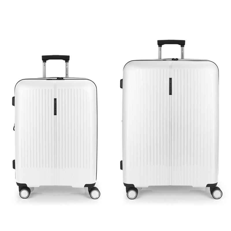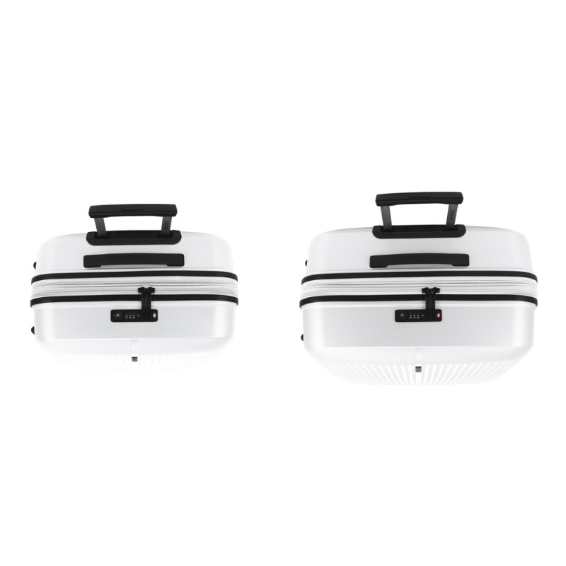 Juego de 2 maletas (Mediana y Grande) rígidas y 4 ruedas dobles multidirección. Expandibles en todos los tamaños. Fabricadas en Polipropileno. Su interior esta compuesto por un forro de material reciclado, con doble separador y bolsllos. Cremallera de seguridad. Cerradura TSA. 10 años de garantía. Medidas sin y con expandible: Maleta Mediana: 45x65x27/30 cm - Peso: 3,4 kg - Capacidad: 70/77,8 L. Maleta Grande: 51x75x31/34 cm - Peso: 4,5 kg - Capacidad: 109/119,6 L.