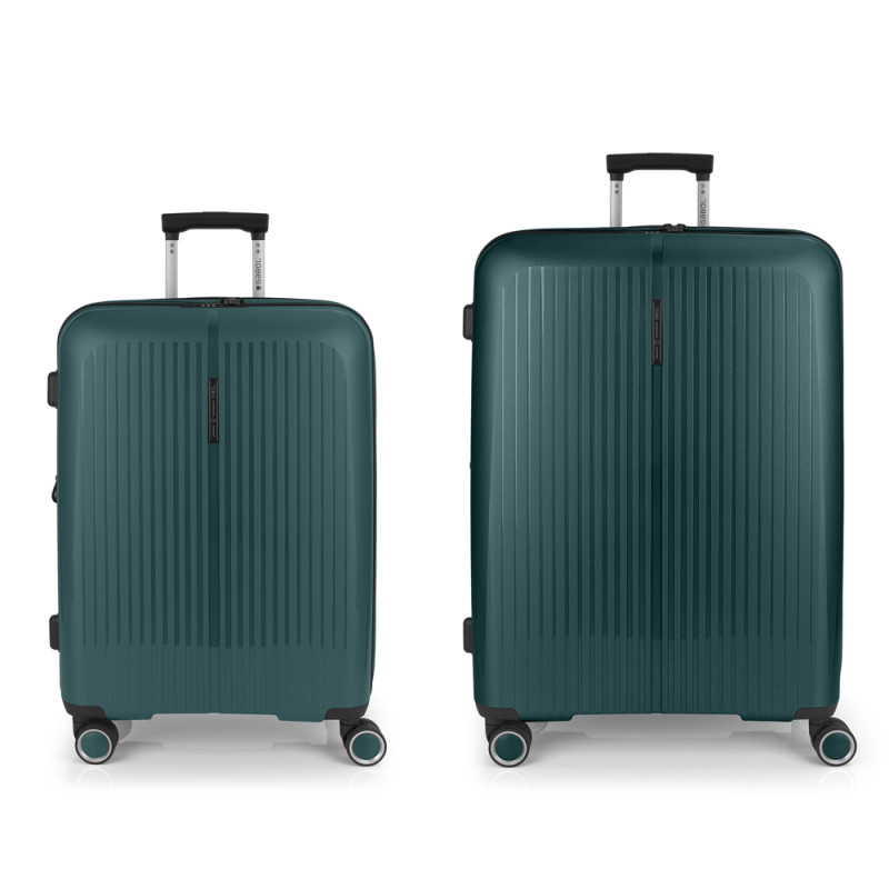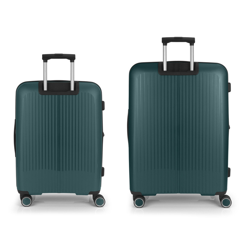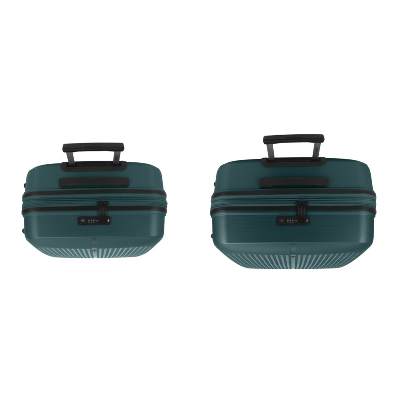 Juego de 2 maletas (Mediana y Grande) rígidas y 4 ruedas dobles multidirección. Expandibles en todos los tamaños. Fabricadas en Polipropileno. Su interior esta compuesto por un forro de material reciclado, con doble separador y bolsllos. Cremallera de seguridad. Cerradura TSA. 10 años de garantía. Medidas sin y con expandible: Maleta Mediana: 45x65x27/30 cm - Peso: 3,4 kg - Capacidad: 70/77,8 L. Maleta Grande: 51x75x31/34 cm - Peso: 4,5 kg - Capacidad: 109/119,6 L.