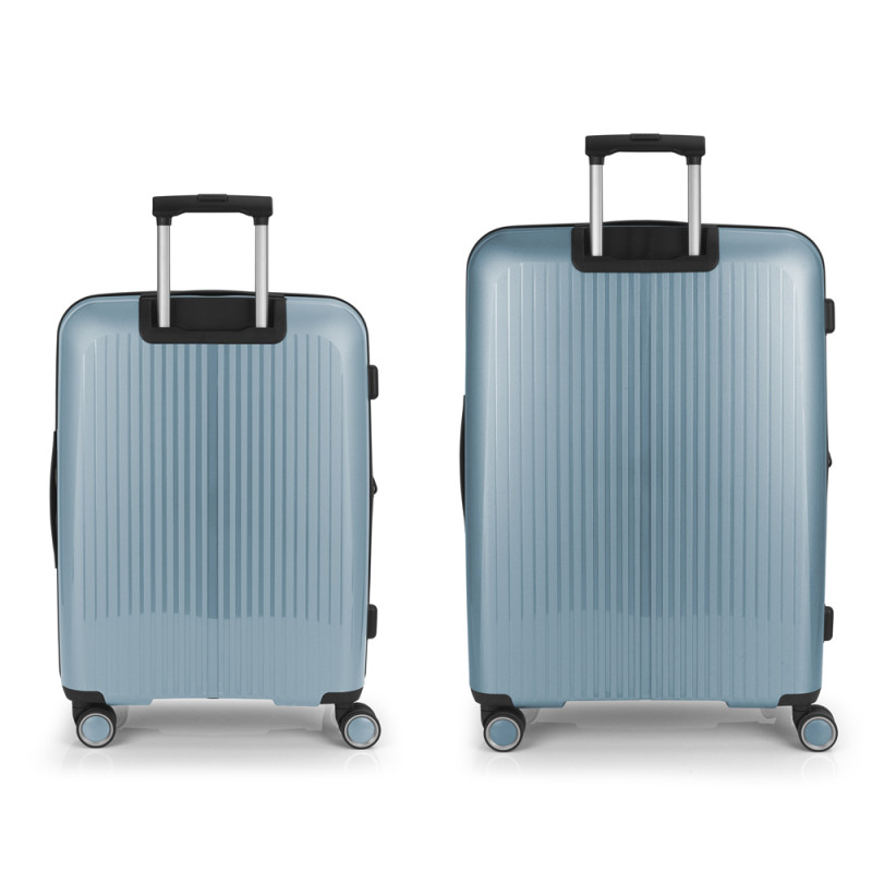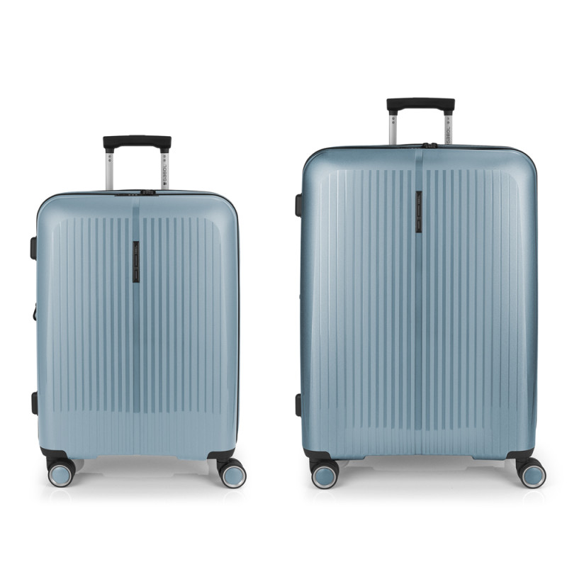 Juego de 2 maletas (Mediana y Grande) rígidas y 4 ruedas dobles multidirección. Expandibles en todos los tamaños. Fabricadas en Polipropileno. Su interior esta compuesto por un forro de material reciclado, con doble separador y bolsllos. Cremallera de seguridad. Cerradura TSA. 10 años de garantía. Medidas sin y con expandible: Maleta Mediana: 45x65x27/30 cm - Peso: 3,4 kg - Capacidad: 70/77,8 L. Maleta Grande: 51x75x31/34 cm - Peso: 4,5 kg - Capacidad: 109/119,6 L.