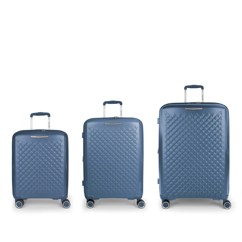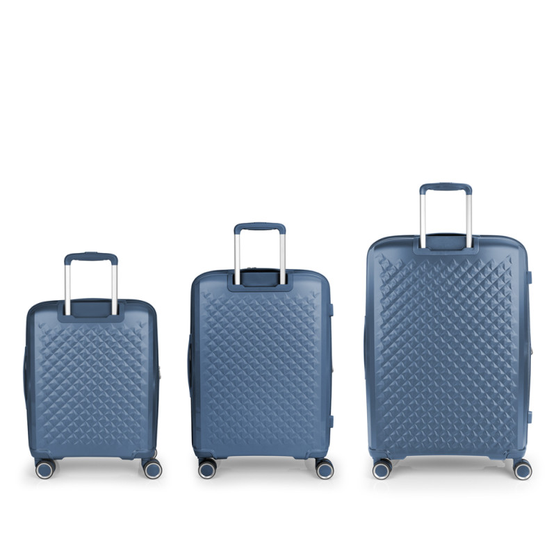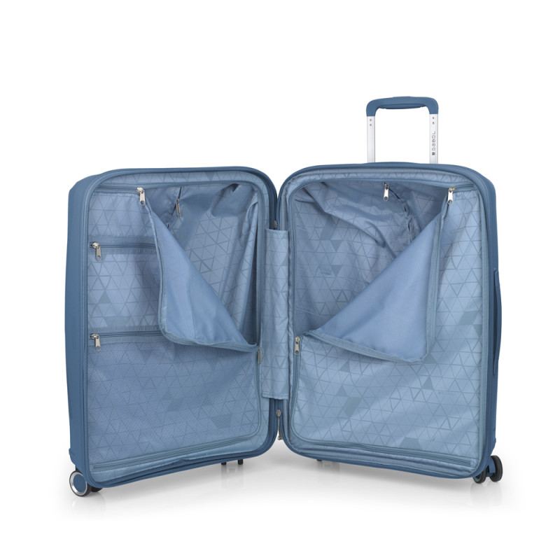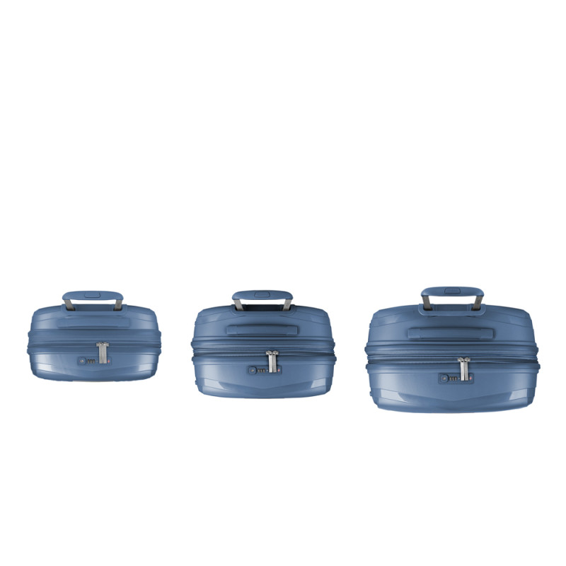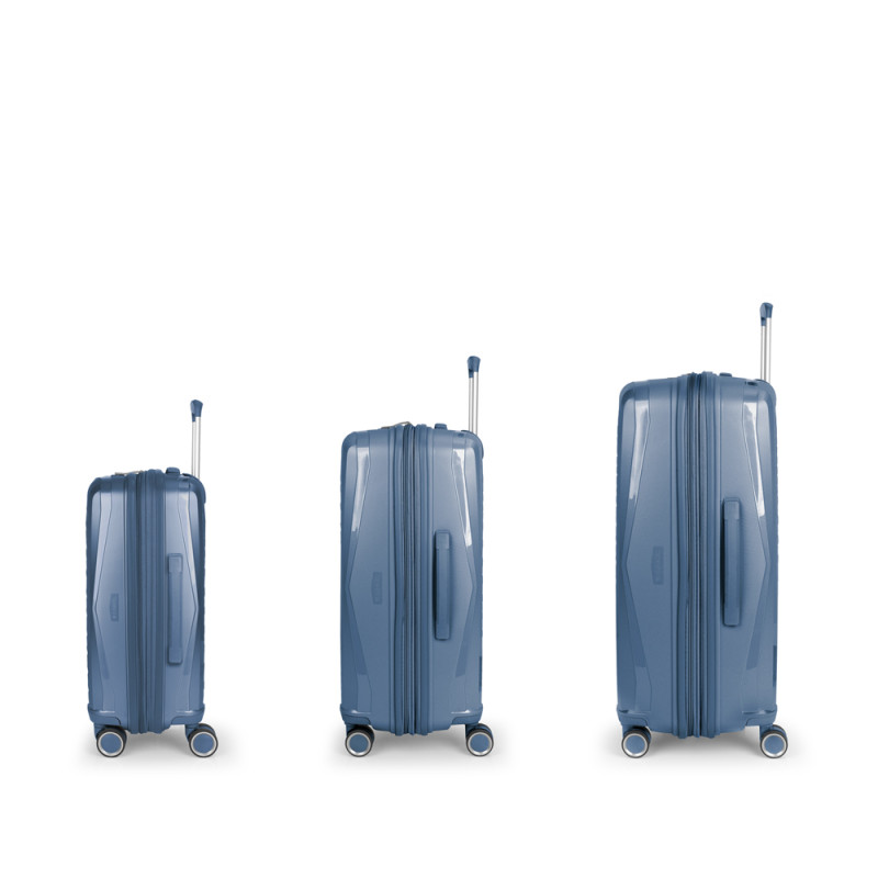 Juego de 3 maletas (Cabina, Mediana y Grande) rígidas y 4 ruedas dobles multidirección. Fabricadas en polipropileno. Su interior está compuesto por un forro de material reciclado de alta calidad con doble separador y bolsillo. Cerradura TSA. Medidas sin y con expandible: Maleta Cabina: 40x54x22/25 cm - Peso: 2,8 kg - Capacidad: 42,1/47,9 L. Maleta Mediana: 44x64,5x28/31 cm - Peso: 3,3 kg - Capacidad: 72,5/80,2 L. Maleta Grande:51x75x31/34 cm - Peso: 4,3 kg - Capacidad: 109,6/120,2L.