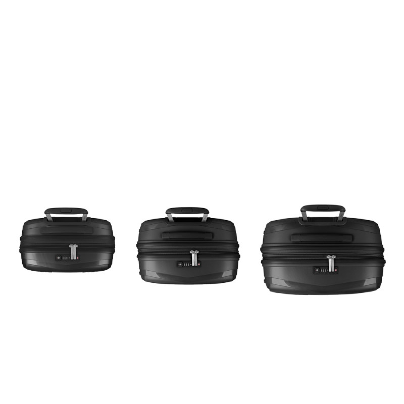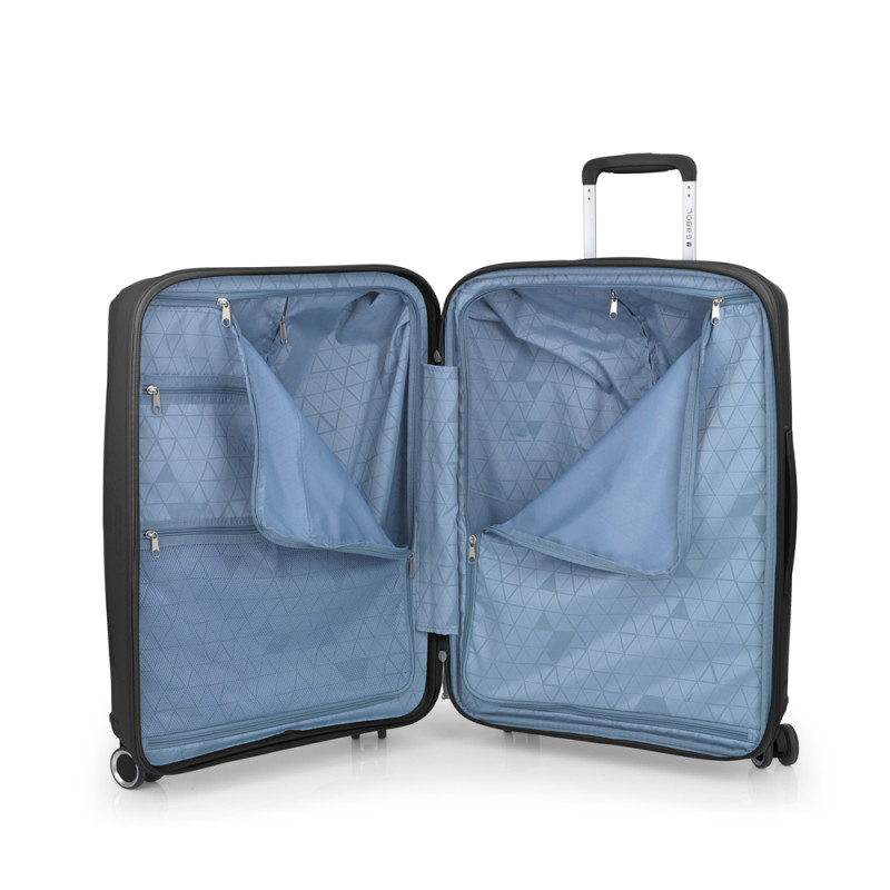 Juego de 3 maletas (Cabina, Mediana y Grande) rígidas y 4 ruedas dobles multidirección. Fabricadas en polipropileno. Su interior está compuesto por un forro de material reciclado de alta calidad con doble separador y bolsillo. Cerradura TSA. Medidas sin y con expandible: Maleta Cabina: 40x54x22/25 cm - Peso: 2,8 kg - Capacidad: 42,1/47,9 L. Maleta Mediana: 44x64,5x28/31 cm - Peso: 3,3 kg - Capacidad: 72,5/80,2 L. Maleta Grande:51x75x31/34 cm - Peso: 4,3 kg - Capacidad: 109,6/120,2L.