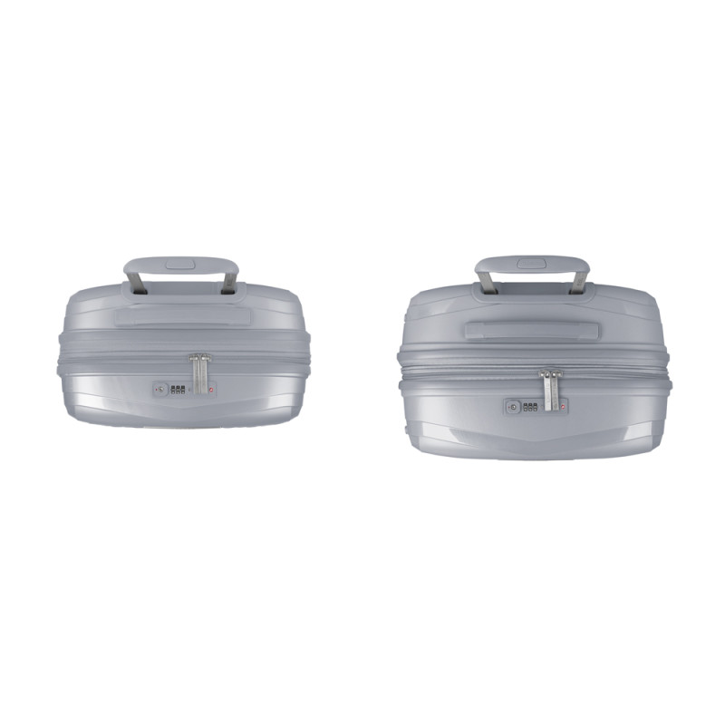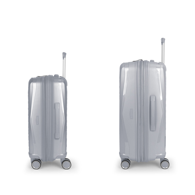 Juego de 2 maletas (Cabina y Mediana) rígidas, expandibles y 4 ruedas dobles multidirección. Fabricadas en polipropileno. Su interior está compuesto por un forro de material reciclado de alta calidad con doble separador y bolsillo. Cerradura TSA. Medidas sin y con expandible: Maleta Cabina: 40x54x22/25 cm - Peso: 2,8 kg - Capacidad: 42,1/47,9 L. Maleta Mediana: 44x64,5x28/31 cm - Peso: 3,3 kg - Capacidad: 72,5/80,2 L.