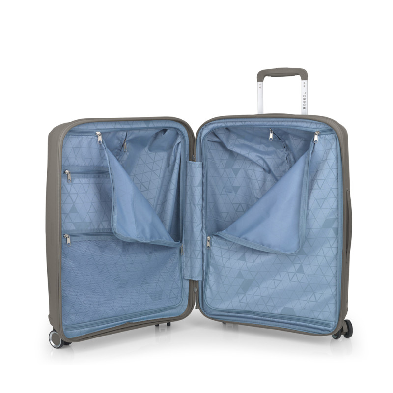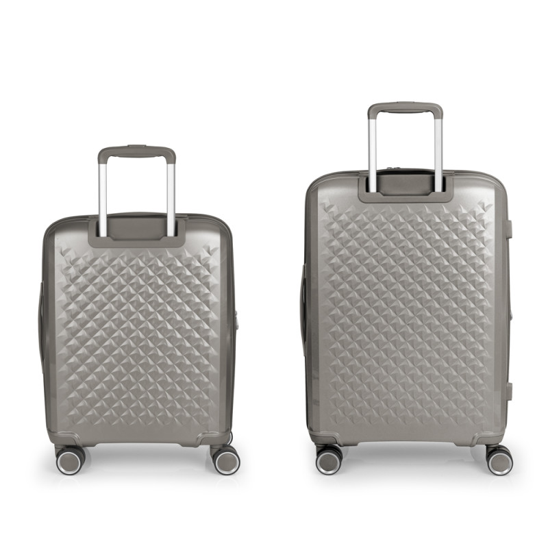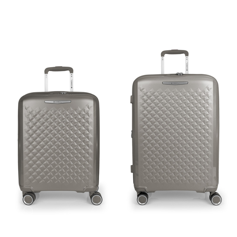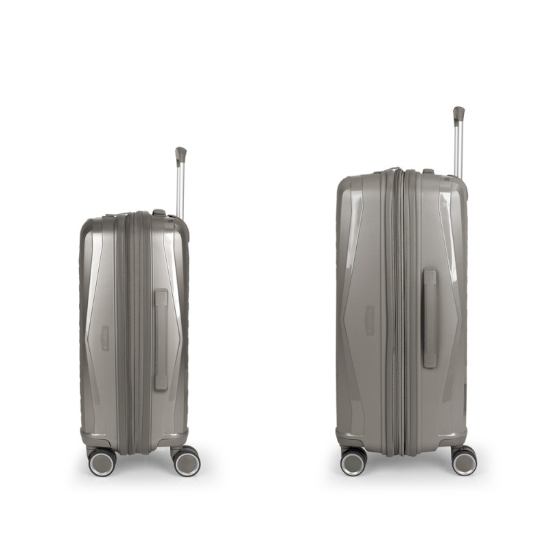 Juego de 2 maletas (Cabina y Mediana) rígidas, expandibles y 4 ruedas dobles multidirección. Fabricadas en polipropileno. Su interior está compuesto por un forro de material reciclado de alta calidad con doble separador y bolsillo. Cerradura TSA. Medidas sin y con expandible: Maleta Cabina: 40x54x22/25 cm - Peso: 2,8 kg - Capacidad: 42,1/47,9 L. Maleta Mediana: 44x64,5x28/31 cm - Peso: 3,3 kg - Capacidad: 72,5/80,2 L.