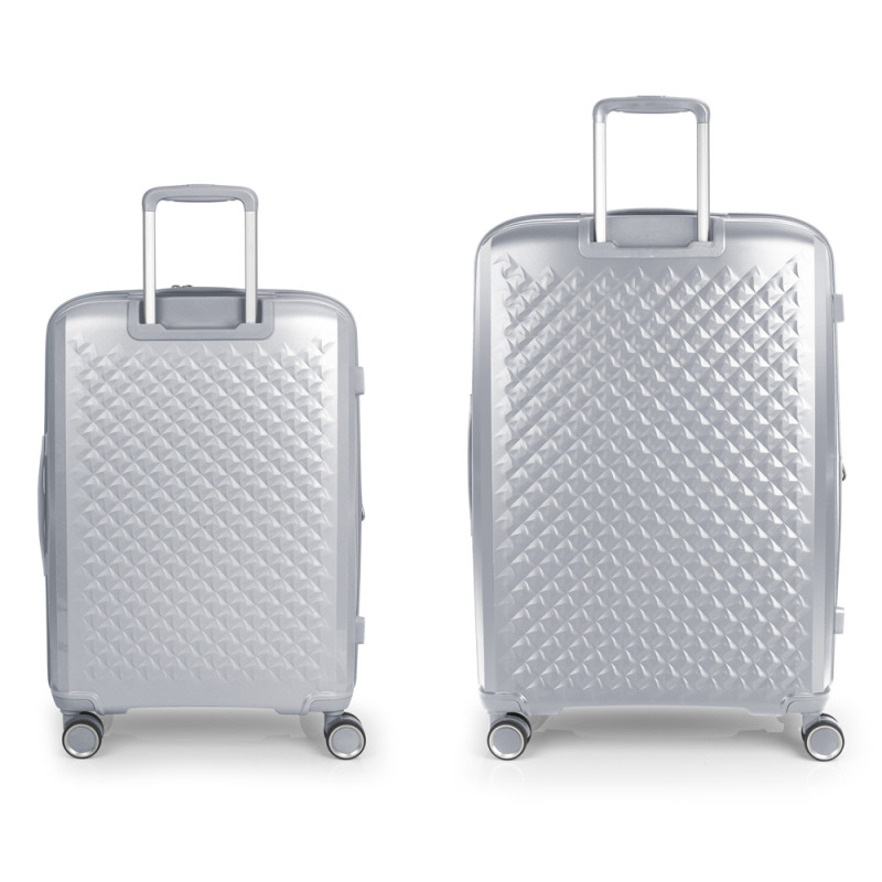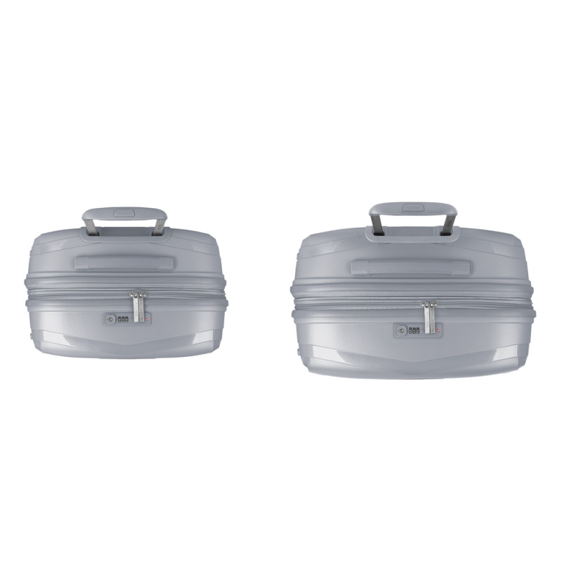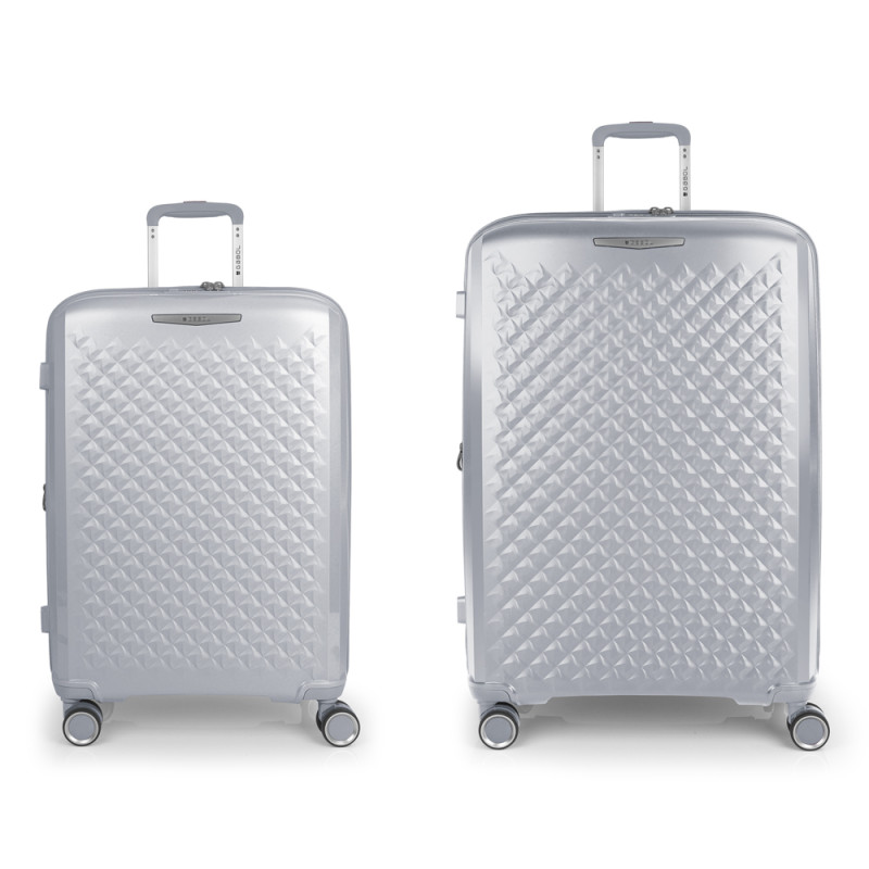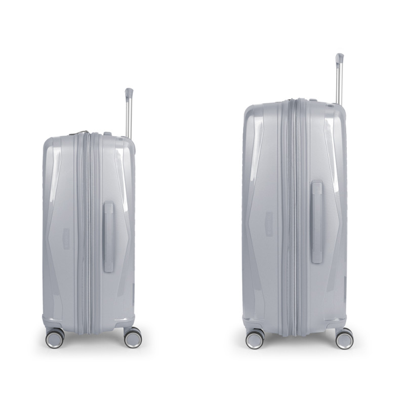 Juego de 2 maletas (mediana y grande) rígidas, expandibles y 4 ruedas dobles multidirección. Fabricadas en polipropileno. Su interior está compuesto por un forro de material reciclado de alta calidad con doble separador y bolsillo. Cerradura TSA. Medidas sin y con expandible: Maleta Mediana: 44x64,5x28/31 cm - Peso: 3,3 kg - Capacidad: 72,5/80,2 L. Maleta Grande:51x75x31/34 cm - Peso: 4,3 kg - Capacidad: 109,6/120,2L.
