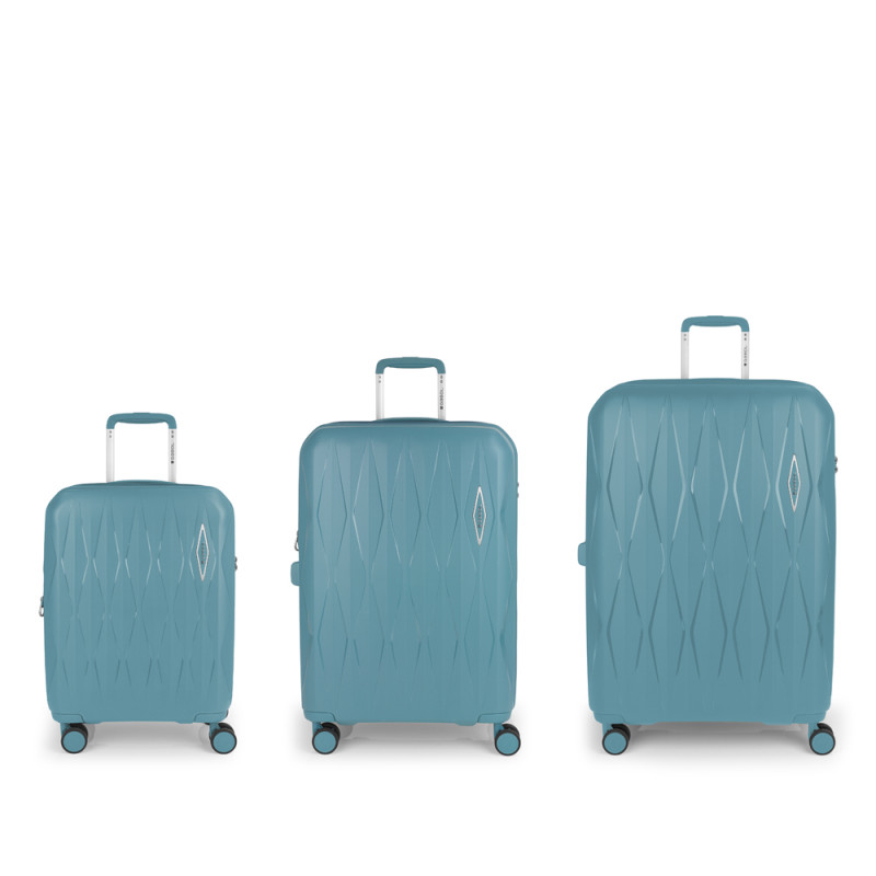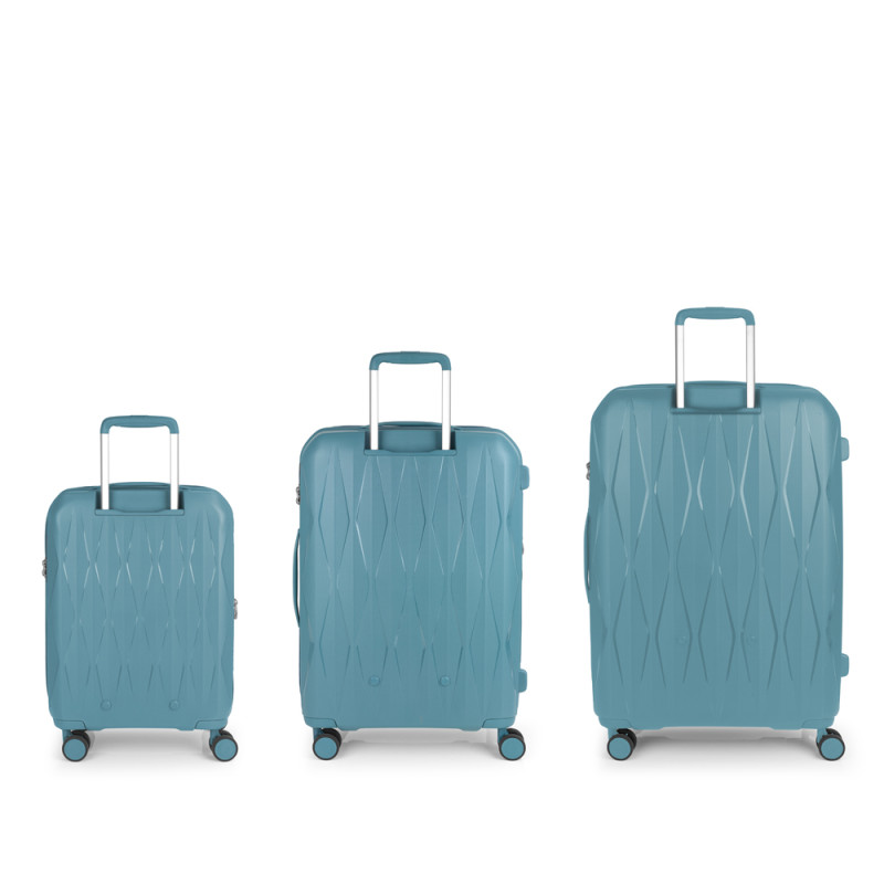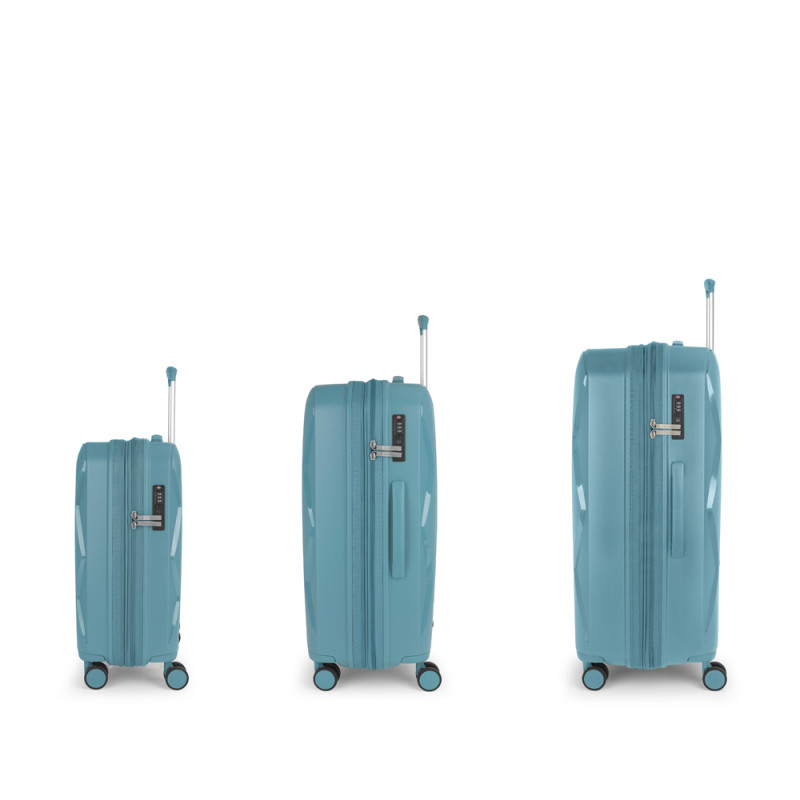 Juego de 3 maletas rígidas (cabina, mediana y grande) expandibles en todos los tamaños, con capacidad hasta 220 L. Fabricadas en polipropileno. Su interior esta compuesto por un forro de material reciclado, con doble separador y bolsllos. 4 ruedas dobles multidirección. Cremallera de seguridad. Cerradura TSA. 10 años de garantía. Medidas sin y con expandible: Maleta cabina: 38x55x22/25 cm - Peso: 2,5 kg - Capacidad: 40,4/46 L. Maleta mediana: 45x66x27/30 cm - Peso: 3,2 kg - Capacidad: 71,3/79,2 L. Maleta grande: 55x75x32/35 cm - Peso: 3,9 kg - Capacidad: 108,7/119 L.