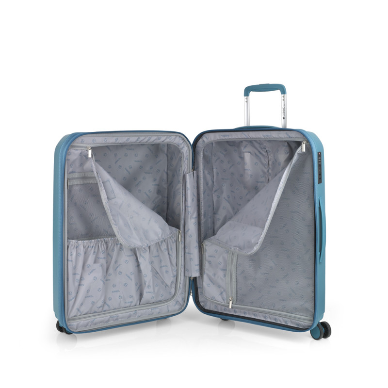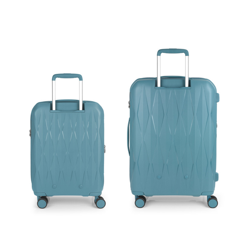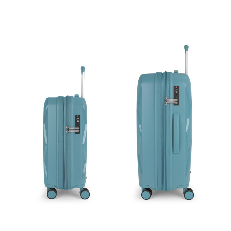 Juego de 2 maletas rígidas (cabina y mediana) expandibles en todos los tamaños, con capacidad hasta 112 L. Fabricadas en polipropileno. Su interior esta compuesto por un forro de material reciclado, con doble separador y bolsllos. 4 ruedas dobles multidirección. Cremallera de seguridad. Cerradura TSA. 10 años de garantía. Medidas sin y con expandible: Maleta cabina: 38x55x22/25 cm - Peso: 2,5 kg - Capacidad: 40,4/46 L. Maleta mediana: 45x66x27/30 cm - Peso: 3,2 kg - Capacidad: 71,3/79,2 L.
