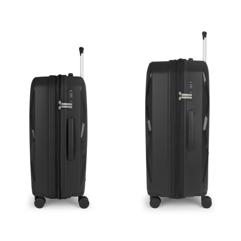 Juego de 2 maletas rígidas (mediana y grande) expandibles en todos los tamaños, con capacidad hasta 180 L. Fabricadas en polipropileno. Su interior esta compuesto por un forro de material reciclado, con doble separador y bolsllos. 4 ruedas dobles multidirección. Cremallera de seguridad. Cerradura TSA. 10 años de garantía. Medidas sin y con expandible: Maleta mediana: 45x66x27/30 cm - Peso: 3,2 kg - Capacidad: 71,3/79,2 L. Maleta grande: 55x75x32/35 cm - Peso: 3,9 kg - Capacidad: 108,7/119 L.