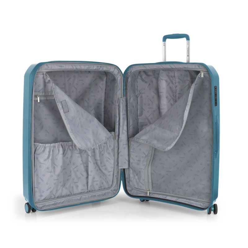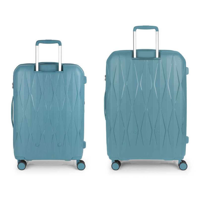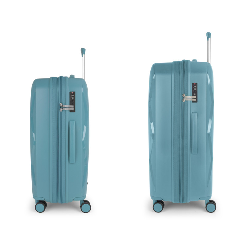 Juego de 2 maletas rígidas (mediana y grande) expandibles en todos los tamaños, con capacidad hasta 180 L. Fabricadas en polipropileno. Su interior esta compuesto por un forro de material reciclado, con doble separador y bolsllos. 4 ruedas dobles multidirección. Cremallera de seguridad. Cerradura TSA. 10 años de garantía. Medidas sin y con expandible: Maleta mediana: 45x66x27/30 cm - Peso: 3,2 kg - Capacidad: 71,3/79,2 L. Maleta grande: 55x75x32/35 cm - Peso: 3,9 kg - Capacidad: 108,7/119 L.