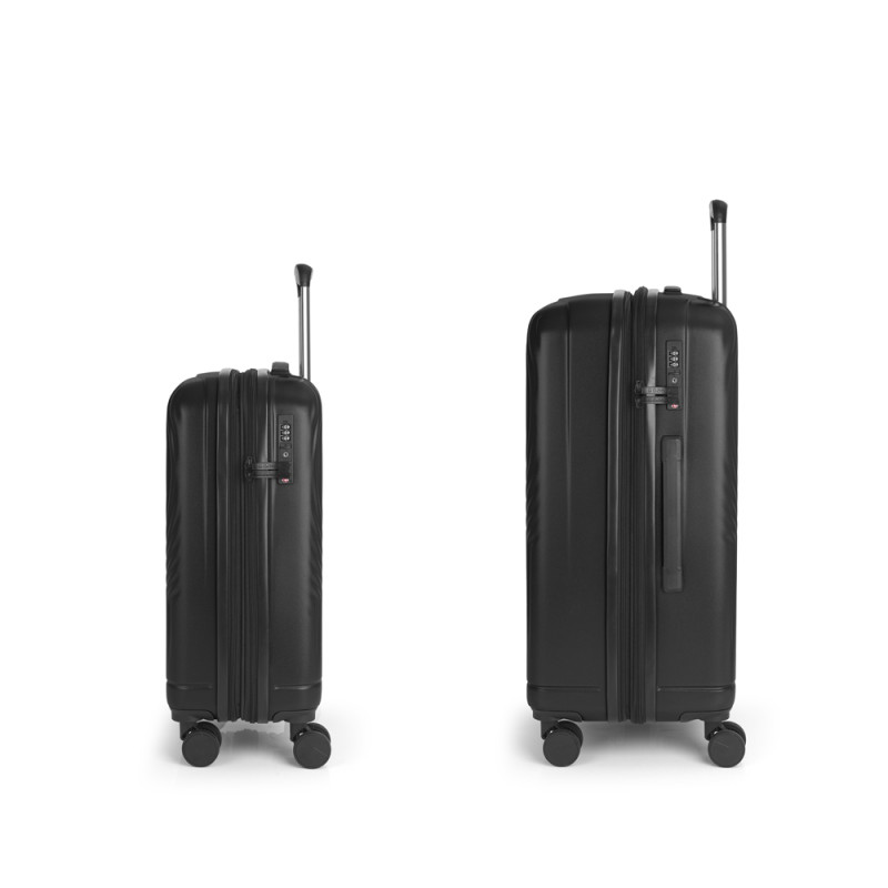 Juego de 2 maletas rígidas (cabina y mediana) expandibles en todos los tamaños, con capacidad hasta 110 L. Fabricadas en Policarbonato. Su interior esta compuesto por un forro de material reciclado, con doble separador y bolsllos. 4 ruedas dobles multidirección. Cremallera de seguridad. Cerradura TSA. 10 años de garantía. Medidas sin y con expandible: Maleta cabina: 40x55x22/24cm - Peso: 3 kg - Capacidad: 37/44,4 L. Maleta mediana: 45x65x28/31 cm - Peso: 3,6 kg - Capacidad: 72,6/80,4 L.