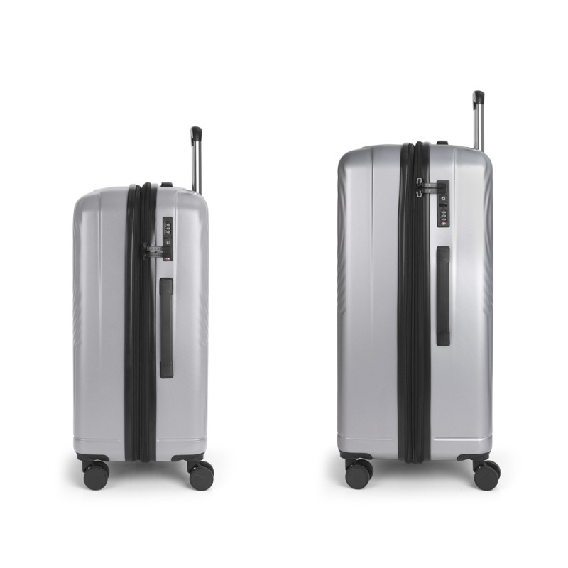 Juego de 2 maletas rígidas (mediana y grande) expandibles en todos los tamaños, con capacidad hasta 187 L. Fabricadas en Policarbonato. Su interior esta compuesto por un forro de material reciclado, con doble separador y bolsllos. 4 ruedas dobles multidirección. Cremallera de seguridad. Cerradura TSA. 10 años de garantía. Medidas sin y con expandible: Maleta mediana: 45x65x28/31 cm - Peso: 3,6 kg - Capacidad: 72,6/80,4 L. Maleta grande: 51x76x33/37 cm - Peso: 4,6 kg - Capacidad: 114/128 L.