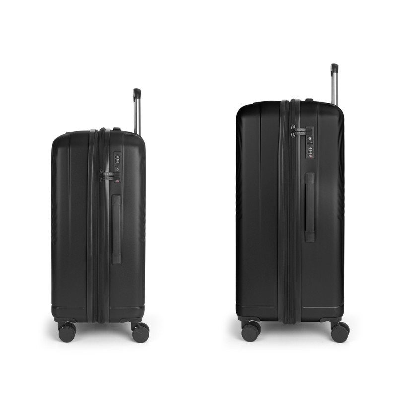 Juego de 2 maletas rígidas (mediana y grande) expandibles en todos los tamaños, con capacidad hasta 187 L. Fabricadas en Policarbonato. Su interior esta compuesto por un forro de material reciclado, con doble separador y bolsllos. 4 ruedas dobles multidirección. Cremallera de seguridad. Cerradura TSA. 10 años de garantía. Medidas sin y con expandible: Maleta mediana: 45x65x28/31 cm - Peso: 3,6 kg - Capacidad: 72,6/80,4 L. Maleta grande: 51x76x33/37 cm - Peso: 4,6 kg - Capacidad: 114/128 L.