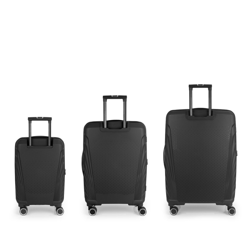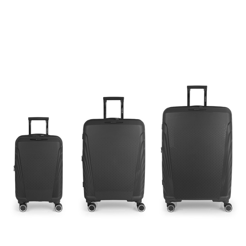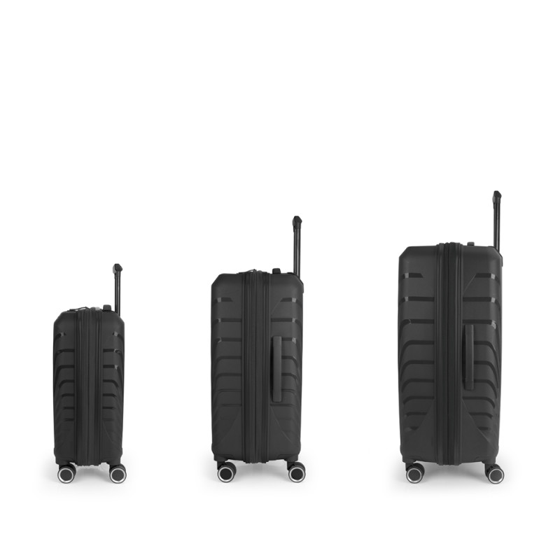 El juego de 3 maletas (Cabina, Mediana y Grande) rígidas SOHO cuenta con 4 ruedas dobles multidirección. Están fabricadas en Polipropileno, y su interior está compuesto por un forro de material reciclado de alta calidad e incluye separadores, cintas de sujeción para una mejor organización y bolsillo. Incorpora una cerradura TSA para viajar con total seguridad, además de llevar cremallera de seguridad para una mayor protección del contenido. Las medidas se explican sin y con expandible: Maleta Cabina: 55 x 35 x 21/24 cm, una capacidad de 35,3/40,3L y un peso de 2,8 kg. Maleta Mediana: 47x67x27/30 cm, un volumen de 71,2/79,2L y su peso de 3,4 kg. Maleta Grande: 53 x 77 x 22 cm | Capacidad: 110,6 /121,3L | Peso: 4,5 kg.