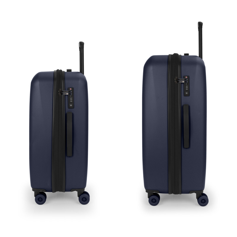 Juego de 2 maletas rígidas (mediana y grande) expandible en todos los tamaños. Fabricadas en polipropileno. Su interior esta compuesto con un forro de material reciclado, un separador y un bolsillo. Cuenta con 4 ruedas dobles silenciosas y cerradura TSA. Medidas sin y con expandible: Maleta mediana: 44x65x27/30 cm - Peso: 3,5 kg - Capacidad: 69/76,5 L. Maleta grande: 51x75x30/33 cm - Peso: 4,2 kg - Capacidad: 102/112,2 L.