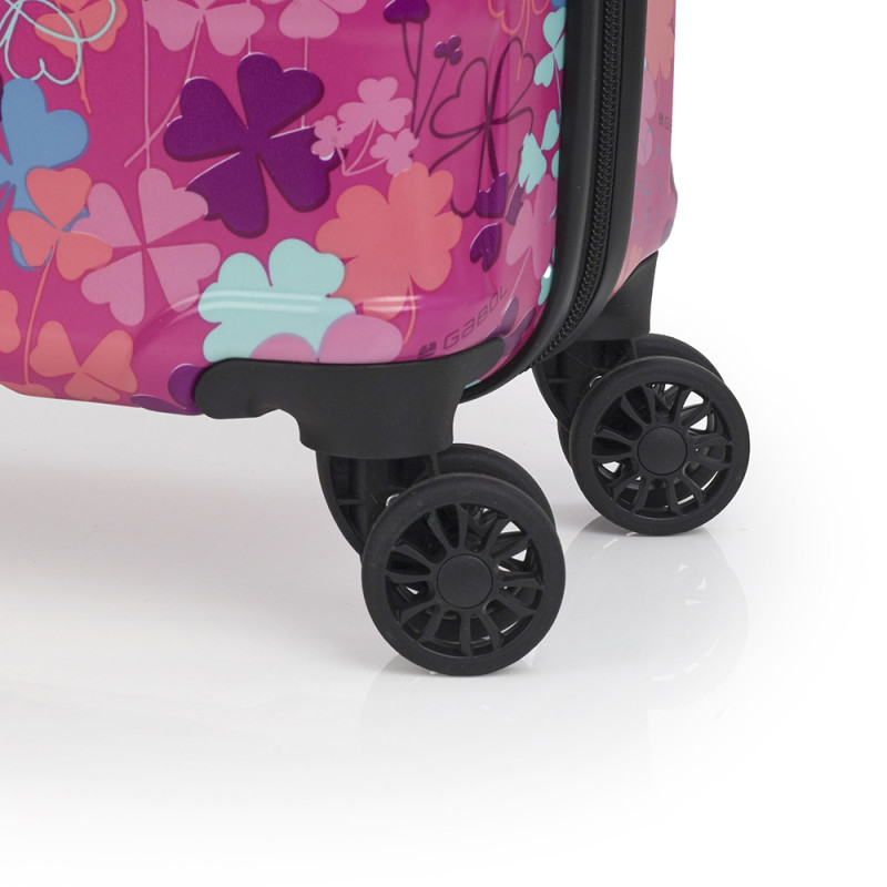 Maleta de cabina Gabol CLOVER. Colección Clover de Gabol, con un bonito estampado de tréboles sobre un fondo rosa. Maleta de cabina con 4 ruedas dobles, con capacidad total de 37,6L. El material de fabricación es ABS y Policarbonato y su interior está compuesto por un forro de alta calidad con bolsillos. Maleta de cabina apta como equipaje de mano. Incluye cerradura TSA. Medidas Maleta Cabina: 40x55x20 cm