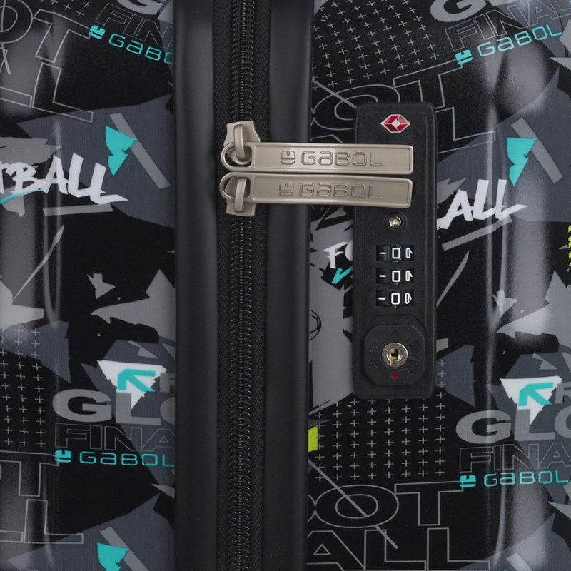 Maleta de cabina Gabol SCORE. Colección Score de Gabol, con un bonito estampado de elementos del fútbol sobre un fondo negro. Maleta de cabina con 4 ruedas dobles, con capacidad total de 37,6L. El material de fabricación es ABS y policarbonato y su interior está compuesto por un forro de alta calidad con bolsillos. Maleta de cabina apta como equipaje de mano. Incluye cerradura TSA. Medidas Maleta Cabina: 40x55x20 cm
