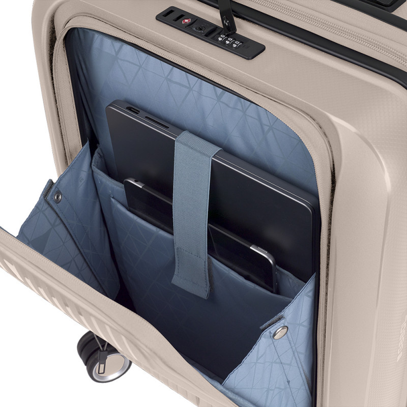 Maleta cabina con bolsillo frontal rígida, con expandible y capacidad hasta 41,7 L. Fabricada en polipropileno.