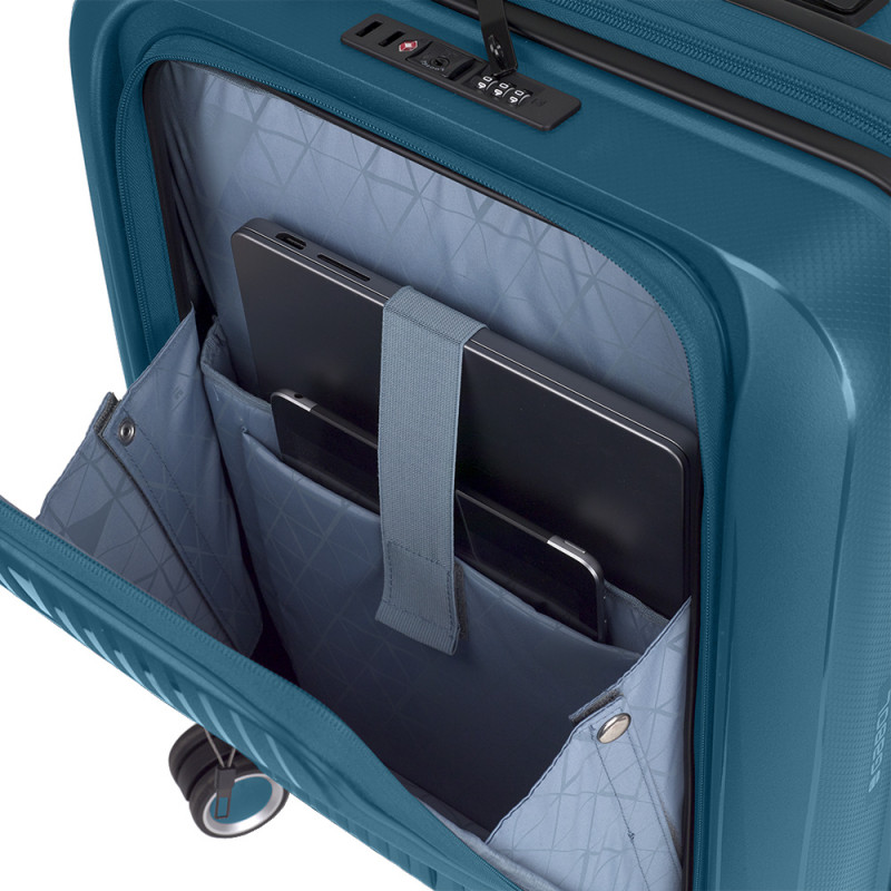 Maleta cabina con bolsillo frontal rígida, con expandible y capacidad hasta 41,7 L. Fabricada en polipropileno.
