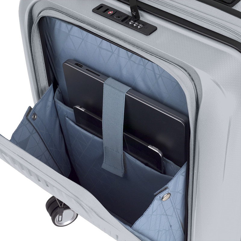 "Maleta cabina con bolsillo frontal rígida, con expandible y con capacidad hasta 41,7 L. Fabricada en polipropileno. Su interior está compuesto por un forro de material reciclado, con doble separador y bolsillos. 4 ruedas dobles. Cuenta con un bolsillo frontal para el portátil de 15,6''. Cremallera de seguridad. Cerradura TSA. 10 años de garantía. Medidas sin y con expandible: Maleta cabina con bolsillo frontal: 40x55x22/25 cm - Peso: 3,1 kg - Capacidad: 41,7/47,4 L. """