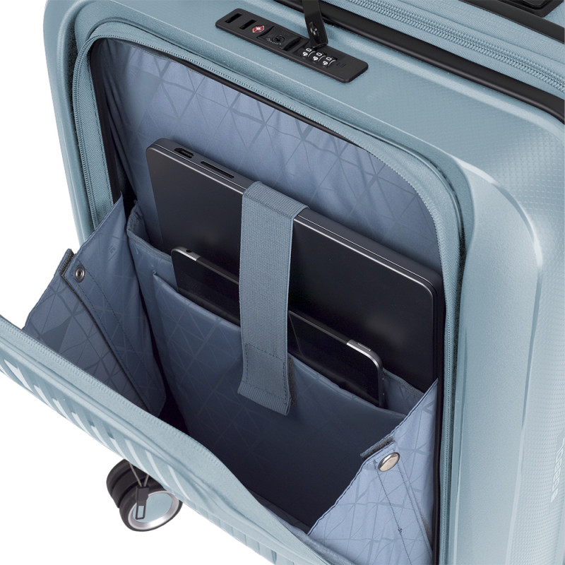 "Maleta cabina con bolsillo frontal rígida, con expandible y con capacidad hasta 41,7 L. Fabricada en polipropileno. Su interior está compuesto por un forro de material reciclado, con doble separador y bolsillos. 4 ruedas dobles. Cuenta con un bolsillo frontal para el portátil de 15,6''. Cremallera de seguridad. Cerradura TSA. 10 años de garantía. Medidas sin y con expandible: Maleta cabina con bolsillo frontal: 40x55x22/25 cm - Peso: 3,1 kg - Capacidad: 41,7/47,4 L. """